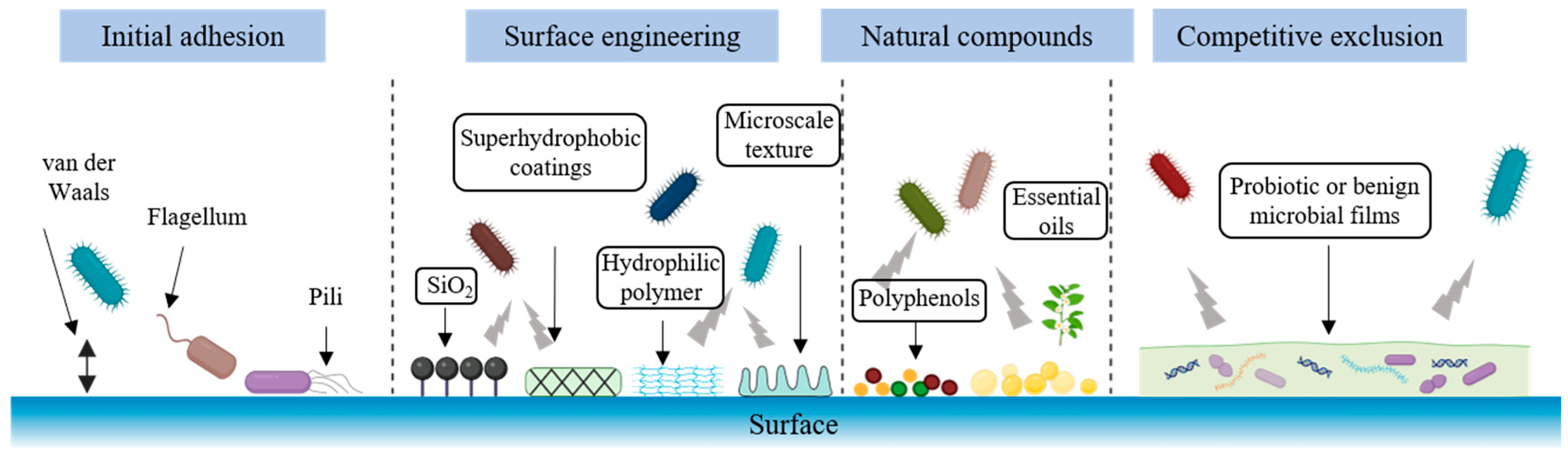 | Initial Adhesion | Surface Engineering and Material Modification (e.g., nano-silica coating) | Alters surface hydrophobicity, charge, roughness | Non-biocidal, reduces bacterial attachment, easier cleaning | Limited coating durability, higher cost | Food-contact surfaces (stainless steel, conveyor belts) | [16] |
