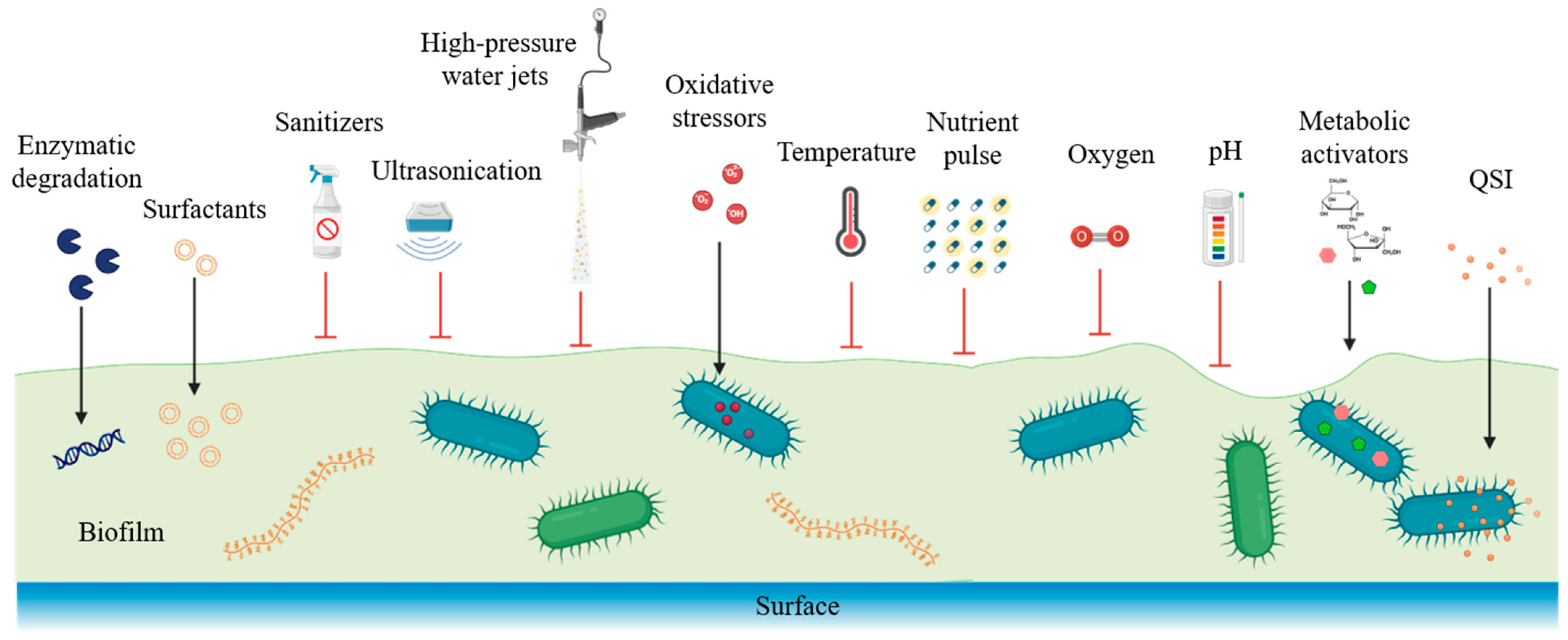 | Dispersion | Induced Controlled Dispersion (e.g., NO-donors, QSIs) | Lowers c-di-GMP levels, activates dispersal mechanisms | Synchronized dispersal allows centralized removal | Timing is hard to control, risk of secondary contamination | Pipes, wet processing areas | [79,80] |