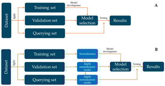 Flowchart of the process carried out to develop the different machine learning models. (A) shows the performance of ML models without the normalisation step. (B) represents the development of ML models with the normalisation step. Figure inspired by Rodríguez-Fernández et al. (2024) [44].