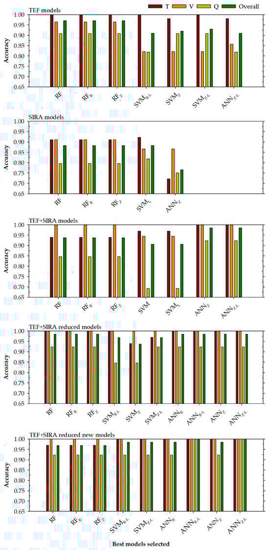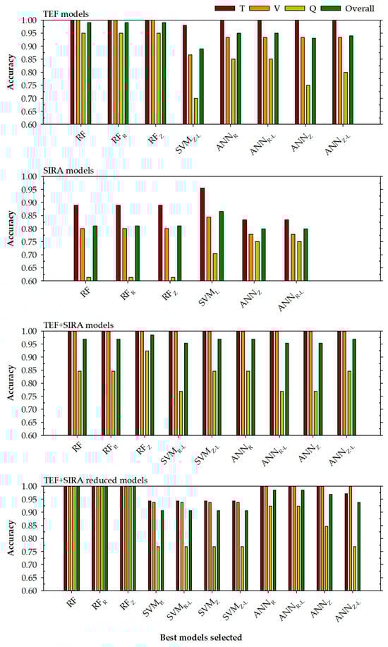 For all data (TVQ), it can be observed that in general, the random forest (accuracy of 0.938) and support vector machine models (accuracy of 0.906) improve for this phase, the models developed only with the SIRA input variables (accuracy between 0.765 and 0.883) and worsen the accuracies presented by the models that use the TEF variables (accuracy between 0.910 and 0.970). However, the selected artificial neural network models (ANNZ and ANNZ-L) improve the accuracy values obtained by the TEF and SIRA selected models, obtaining for all data an accuracy of 0.984 (higher than the accuracies obtained by the RF TEF models—0.970). In addition, these models (ANNZ and ANNZ-L), which integrate TEF + SIRA variables, present for all data a kappa value of 0.982, which is also higher than the kappa values obtained by the random forest models using the TEF variables (0.965).