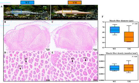 Histological features of muscle fiber in WT and YM T. siluroides. (A): The sampling sites in the muscles of WT and YM T. siluroides; (B,D): The microstructure of WT T. siluroides muscle; (C,E): The microstructure of YM T. siluroides muscle. (F): Comparison of muscle fiber diameter and density between WT and YM T. siluroides. En. Endomysium; MF. Muscle fiber.
