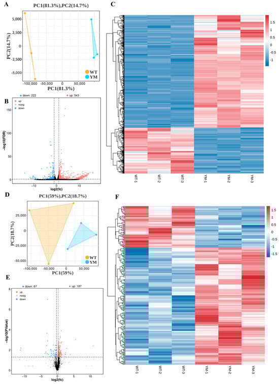 Transcriptomic and proteomic profiling of WT and YM T. siluroides muscle. (A): PCA plot of muscle samples for transcriptome. (B): Volcano plot of DEGs between WT and YM T. siluroides. The blue dots represent down-regulation of gene expression, the red dots indicate upregulation of gene expression, and the black dots signify genes with no significant differences in expression. (C): The heatmap of DEGs between WT and YM T. siluroides. (D): PCA plot of muscle samples for proteome. (E): Volcano plot of DEPs between WT and YM T. siluroides. (F): The heatmap of DEPs between WT and YM T. siluroides.