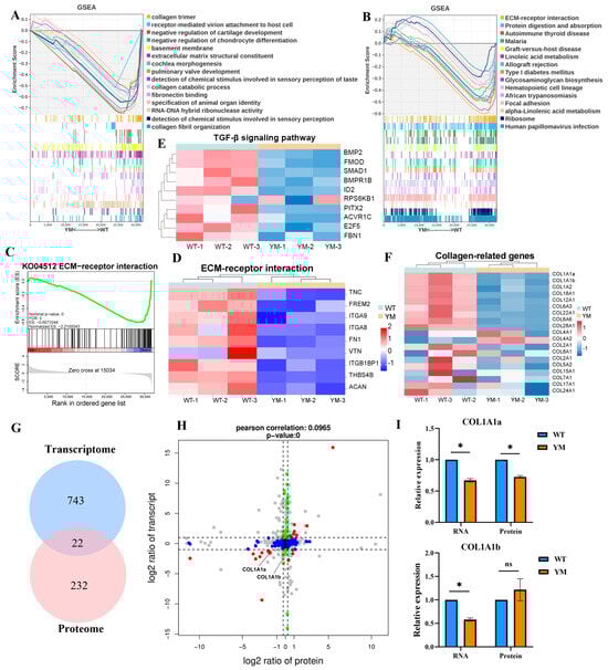 Multi-omics co-expression analysis of collagen and ECM pathways in WT and YM T. siluroides muscle. (A): GSEA plot of GO terms, revealing suppression of relevant biological processes in YM T. siluroides muscle. (B): GSEA plot of KEGG pathways, indicating downregulation of associated signaling pathways in YM. (C): GSEA curve for ECM-receptor interaction (KEGG: ko04512). (D): Heatmap of some ECM-receptor interaction pathway genes. (E): Heatmap of genes of TGF-βsignaling pathway. (F): Heatmap of collagen-related genes. (G): Integrated analysis of transcriptome and proteome, Venn diagram of DEGs (n = 743) and DEPs (n = 232), with 22 overlaps. (H): Nine-quadrant plot of the integrated analysis of transcriptome and proteome. (I): Relative expression levels of COL1A1a and COL1A1b at RNA and protein levels in WT and YM T. siluroides muscle. * = p < 0.05; ns = non-significant.