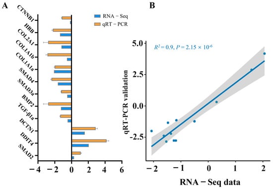 To validate the RNA sequencing results, 12 genes were subjected to confirmation via qRT-PCR. In accordance with the MIQE guidelines, the NormFinder program was used to evaluate the expression stability of three candidate reference genes: β-actin, GAPDH, and EF1a. The calculated stability values for β-actin, GAPDH, and EF1α were 0.21, 0.28, and 0.56, respectively. Given its superior stability, β-actin was selected as the reference gene for data normalization in this study. The resulting fold changes derived from qRT-PCR were subsequently compared with the RNA-seq expression data. As depicted in Figure 7, all the genes presented comparable expression patterns in both the qRT-PCR and RNA-seq analyses. A significant correlation was identified between the qRT-PCR and RNA-seq results, confirming the alignment with the results of the transcription analysis.