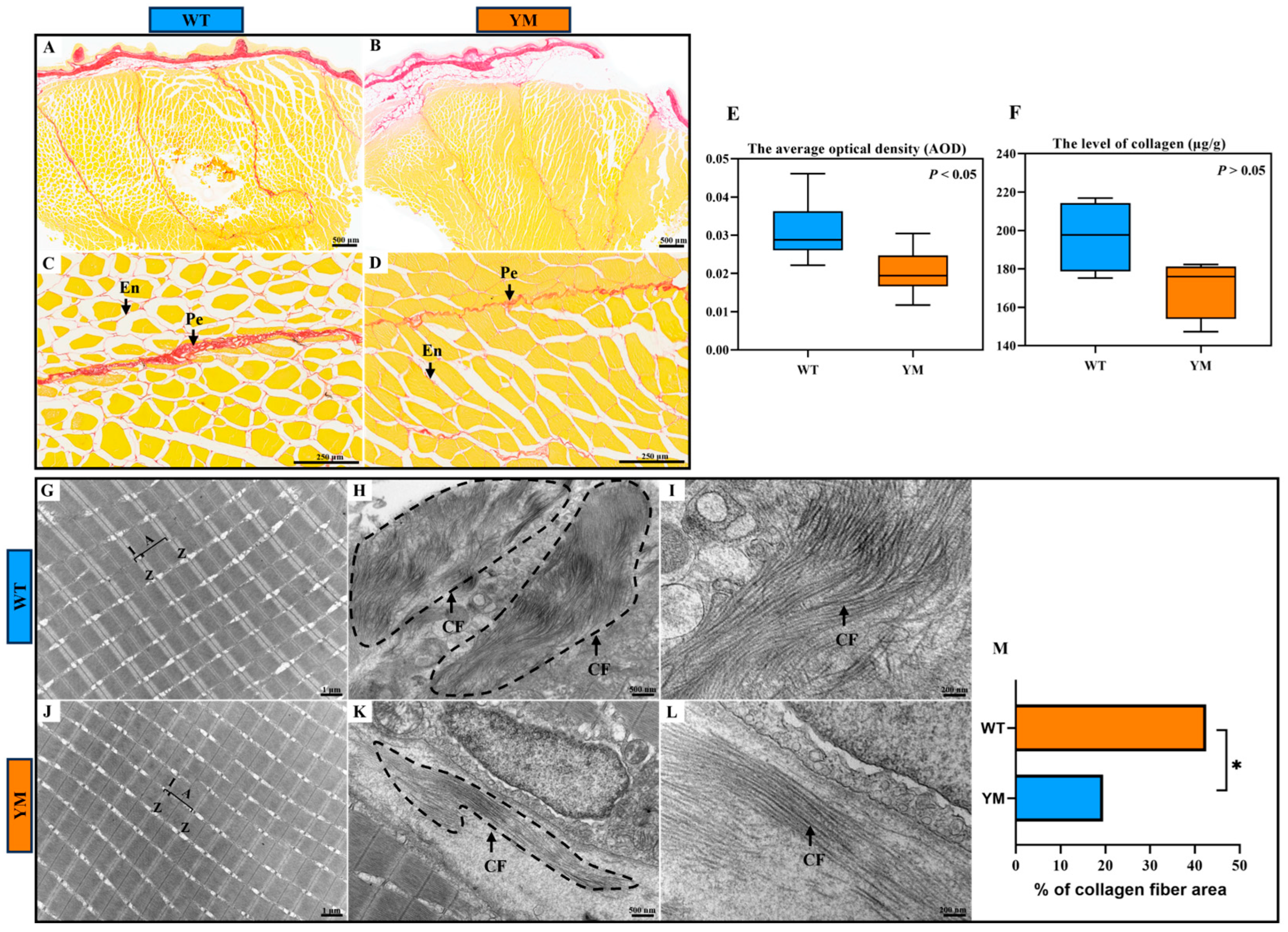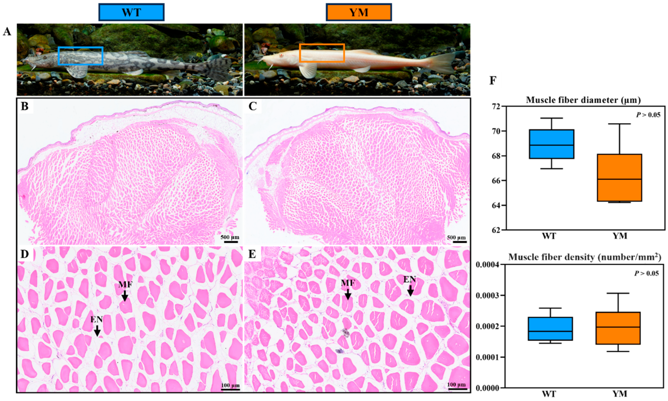 3.2. Muscle Fiber Structure of WT and YM T. siluroides