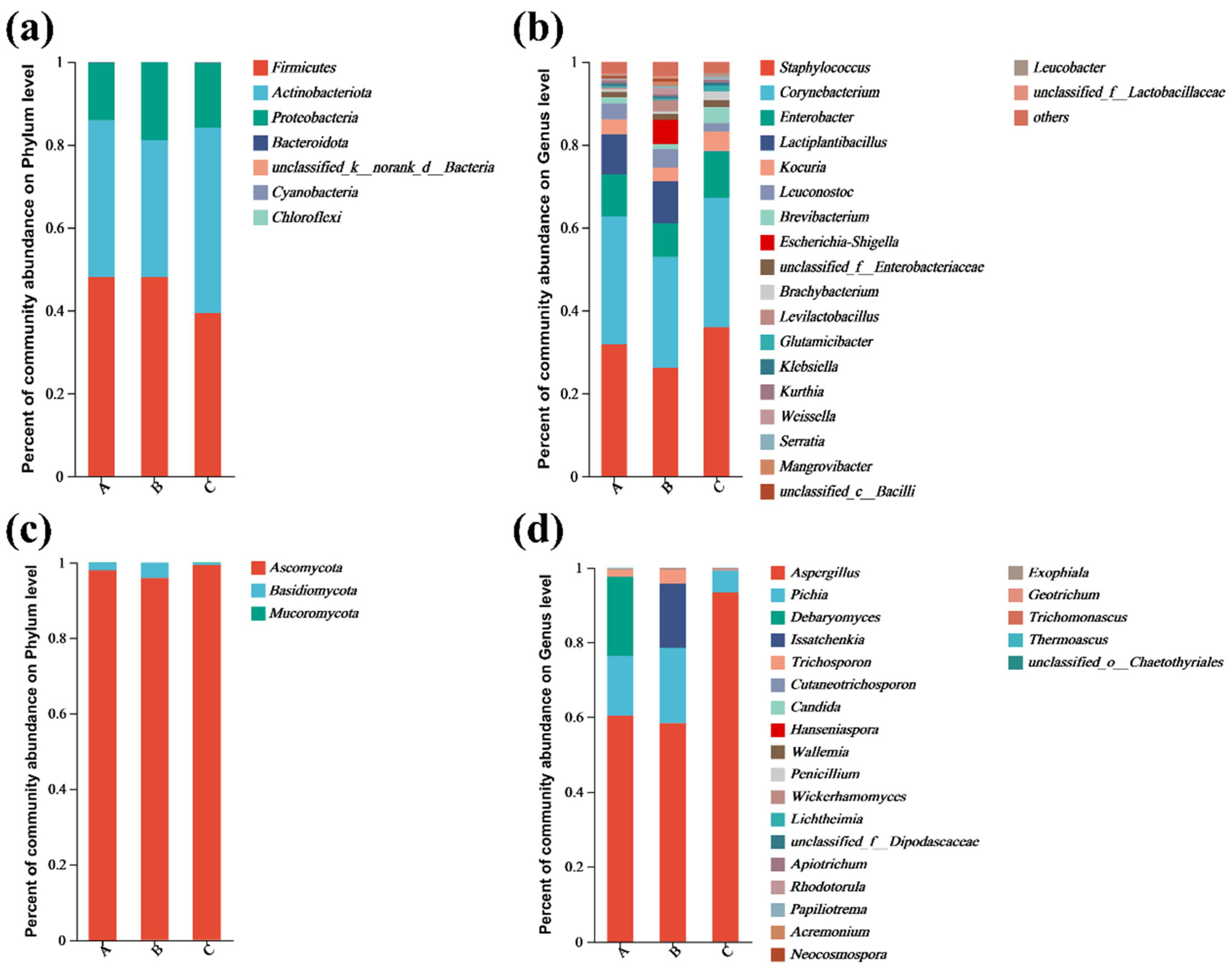 - Niu, C.T.; Xing, X.L.; Zuo, W.J.; Zuo, Z.C.; Liu, F.M.; Liu, C.F.; Li, Q. Construction and application of a synthetic microbial community in reduced salinity fermentation of raw-materials based broad bean paste. Food Biosci. 2024, 61, 104851. [Google Scholar] [CrossRef]