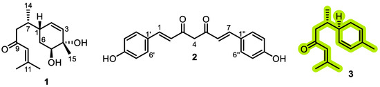 White solid, C15H22O; 1H NMR (500 MHz, CD3OD) δH 6.26 (1H, dd, 2.0; 10.0 Hz, H-3), 6.18 (1H, s, H-10), 5.74 (1H, d, 10.2 Hz, H-6), 5.60 (1H, dd, 1.9; 10.2 Hz, H-5), 2.93 and 1.98 (2H, dd, 2.3; 10.2 Hz, H-8), 2.19 and 1.93 (2H, m, H-2), 2.12 (3H, s, H-15), 2.11 (3H, s, H-12), 1.92 (1H, m, H-1), 1.90 (3H, s, H-13), 1.70 (1H, m, H-7), 0.89 (3H, d, 6.9 Hz, H-14); 13C NMR (125 MHz, CD3OD) δC 203.3 (C-9), 157.2 (C-11), 134.1 (C-6), 132.0 (C-4), 125.0 (C-10), 124.1 (C-5), 121.1 (C-3), 49.8 (C-8), 38.1 (C-1), 34.3 (C-7), 29.9 (C-2), 27.7 (C-13), 21.5 (C-15), 20.9 (C-12), 19.9 (C-14); (+)-FAB-MS m/z 219.2 [M+H]+ (Supplementary Figures S7–S9) [18].