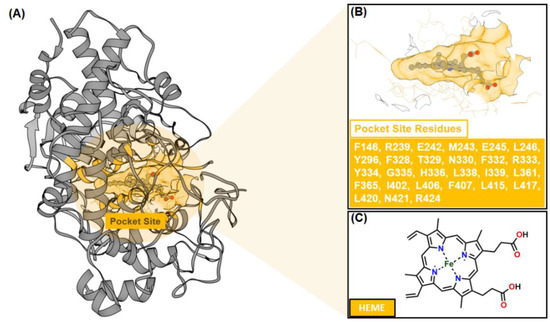 The crystal structure of myeloperoxidase (MPO) as a targeted protein (PDB ID: 1NDU): (A) The co-crystal structure has a co-factor (HEME) that binds to the pocket site. (B) The pocket site has several amino acids (27 residues). The chemical structure of (C) HEME.