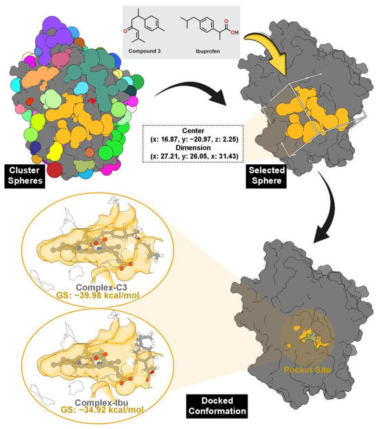 Pocket site identification was carried out using sphere selection based on cluster analysis (Figure 3). A total of 108 cluster spheres were generated and ranked using the DOCK6 program [24]. Cluster 1, corresponding to the region with the highest probability of ligand binding, was selected as the initial coordinate for molecular docking. This cluster coincided precisely with the heme-binding cavity of MPO, consistent with its crystallographic active site.