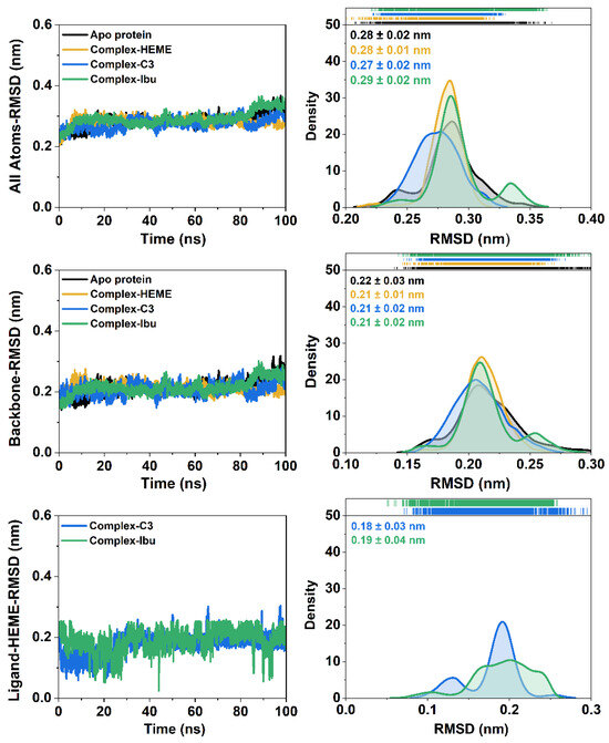 System stability during the 100 ns simulations was assessed through the RMSD analyses of all atoms, backbone atoms, and the heme ligand (Figure 4). All systems exhibited stable trajectories with RMSD fluctuations ≤ 0.4 nm, indicating well-equilibrated dynamics. Among the simulated systems, the C3-MPO complex showed the highest stability, with an all-atom RMSD distribution of ~0.20–0.34 nm and an average of 0.27 ± 0.02 nm, lower than those observed in the other complexes. These results suggested that binding of compound 3 enhances the overall stability of the ligand–heme–protein assembly.