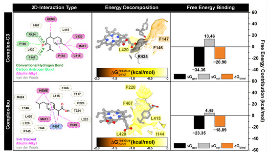 Binding orientation analysis revealed that both compound 3 and ibuprofen occupy positions near the heme and MPO pocket sites. The dominant interactions observed included conventional hydrogen bonds, carbon–hydrogen bonds, hydrophobic interactions (alkyl/π–π stacking), and van der Waals contacts. Interestingly, compound 3 formed two conventional hydrogen bonds with F147 and R424, acting as hydrogen bond acceptors, which likely play an important role in stabilizing the ligand–protein complex [45]. Residue-wise energy decomposition identified eight amino acids (I144, F146, F147, P220, F407, L415, L420, and R424) as significant contributors to ligand stabilization, defined by < −0.5 kcal/mol. Among these, F147 (−1.38 kcal/mol) and R424 (−1.97 kcal/mol) contributed most substantially, consistent with their involvement in hydrogen bonding with compound 3. These findings provide a mechanistic basis for the inhibitory activity of compound 3, suggesting that interactions with these residues are critical for suppressing ROS activity and exerting anti-inflammatory effects.