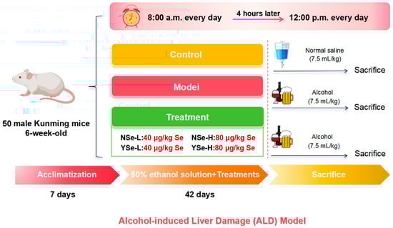 This study strictly adhered to the 3R (Replacement, Reduction, Refinement) principles, and all efforts were made to minimize animal suffering. Fifty 6-week-old male pathogen-free Kunming mice (HFK Co., Ltd., Beijing, China) were group-housed in a standard barrier environment. Bedding was changed three times per week, a 12 h light/dark cycle was maintained, and food and water were provided ad libitum. Following a 7-day acclimatization period, all mice were randomly assigned to six groups: Control group (n = 8), Model group (n = 10), NSe-L group (low-dose sodium selenite, n = 8), NSe-H group (high-dose sodium selenite, n = 8), YSe-L group (low-dose inactivated YSe, n = 8), and YSe-H group (high-dose inactivated YSe, n = 8). At 8:00 a.m. daily, the NSe-L and NSe-H groups received oral gavage of sodium selenite at 40 µg/kg and 80 µg/kg body weight, respectively. The YSe-L and YSe-H groups were administered inactivated YSe at equivalent selenium doses. Four hours later, all groups except the Control group were intragastrically administered 50% (v/v) ethanol at 7.5 mL/kg, while the Control group received an equivalent volume of normal saline. The daily intake of selenium in mice was determined based on human recommended daily intake and interspecies dose conversion principles [12,20]. Following a 42-day intervention, all mice were fasted for 12 h and euthanized by cervical dislocation under deep anesthesia induced by isoflurane. The specific animal experiment process is shown in Figure 1. Blood and tissue samples were collected and processed as described. Serum was isolated by centrifugation (3000 rpm, 25 °C) and stored at −20 °C for biochemical analysis. Organ indices (liver, kidney, spleen) were calculated based on organ weight. Liver and cecal contents were snap-frozen in liquid nitrogen and stored at −80 °C for subsequent analyses. All animal procedures were approved by the Ethics Committee of Institute of Food Science and Technology, Fuzhou University (Approval No.: FZU-IFST-2021018).