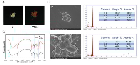 Characterization of the external morphology, micromorphology and chemical functional group structure of Y and YSe. (A) The external morphology of Y and YSe; (B) The micromorphology of Y and YSe observed by SEM and EDX spectra; (C) The chemical functional group structure of Y and YSe revealed by FTIR analysis.
