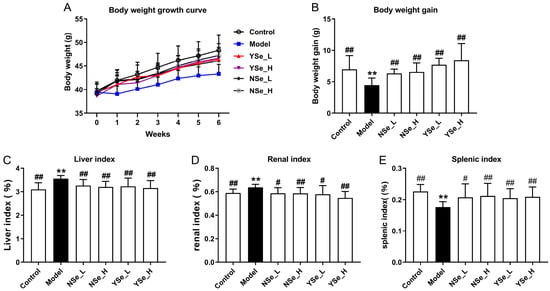 Effects oral administration of inactivated YSe and inorganic Se on growth performance and organ indices in alcohol-exposed mice. (A) Body weight growth curves; (B) Body weight gain; (C) Liver index; (D) kidney index; (E) spleen indexes. Sample sizes: model group, n = 10; other groups, n = 8. Statistical significance was determined by one-way ANOVA followed by Tukey’s post hoc test. ** p < 0.01 versus Control group; # p < 0.05 and ## p < 0.01 versus Model group.