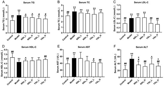 Effects of inactivated YSe and inorganic Se on serum biochemical phenotypes in over-drinking mice. (A) Serum TC; (B) Serum TG; (C) Serum LDL-C; (D) Serum HDL-C; (E) Serum AST; (F) Serum ALT. Sample sizes: model group, n = 10; other groups, n = 8. Statistical significance was determined by one-way ANOVA followed by Tukey’s post hoc test. * p < 0.05 and ** p < 0.01 versus Control group; # p < 0.05 and ## p < 0.01 versus Model group.