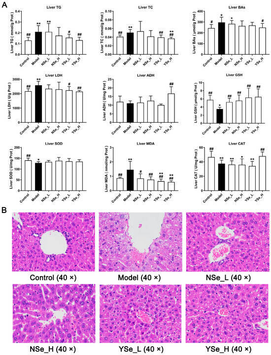 Effects of inactivated YSe and inorganic Se intervention on liver biochemical phenotypes and liver histopathological features in over-drinking mice. (A) Biochemical parameters; (B) Histopathological feature. Sample sizes: model group, n = 10; other groups, n = 8. Statistical significance was determined by one-way ANOVA followed by Tukey’s post hoc test. * p < 0.05 and ** p < 0.01 versus Control group; # p < 0.05 and ## p < 0.01 versus Model group.