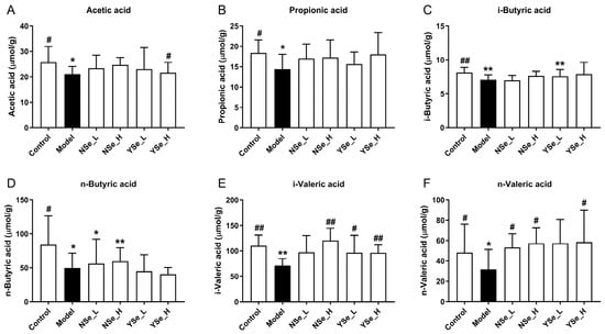 Effects of inactivated YSe and inorganic Se intervention on the levels of fecal SCFAs in over-drinking mice. (A) Acetic acid; (B) Propionic acid; (C) i-Butyric acid; (D) n-Butyric acid; (E) i-Valeric acid; (F) n-Valeric acid. Sample sizes: model group, n = 10; other groups, n = 8. Statistical significance was determined by one-way ANOVA followed by Tukey’s post hoc test. * p < 0.05 and ** p < 0.01 versus Control group; # p < 0.05 and ## p < 0.01 versus Model group.