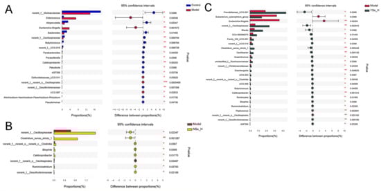 The differences in the abundance of intestinal bacterial genera between different experimental groups. (A) Control group versus Model group; (B) NSe_H group versus Model group; (C) YSe_H group versus Model group. Sample sizes: model group, n = 10; other groups, n = 8. For comparisons between groups, statistical significance was determined by the Wilcoxon rank-sum test (* p < 0.05, ** p < 0.01).