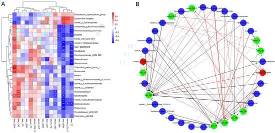 Correlation between intestinal bacteria and biochemical phenotypes. (A) Correlation heat map. Red and blue colors represent positive and negative correlations, respectively. Statistical significance was denoted as * p < 0.05 and ** p < 0.01. (B) Correlation network. Red nodes: intestinal bacteria decreased by inactivated YSe intervention; blue nodes: intestinal bacteria increased by inactivated YSe intervention; green nodes: biochemical parameters. Solid red and the black lines represent positive and negative correlations, respectively. Line width represents the strength of correlation. Only significant correlations (|r| > 0.6, p < 0.05) were plotted in the network.