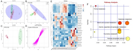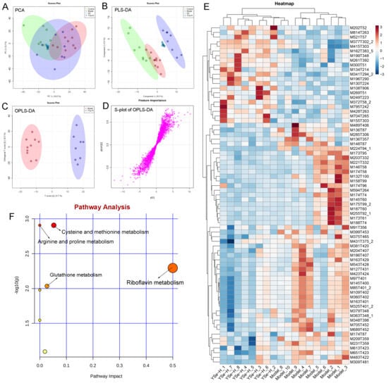 Liver tissue samples (50 mg) were homogenized in 1 mL extraction solvent (acetonitrile: methanol: water = 2:2:1, v/v/v) using ultrasonic disruption at 4 °C for 10 min. The homogenates were centrifuged (12,000× g, 4 °C, 10 min), and the supernatants were vacuum-dried and reconstituted in 200 μL of 80% methanol. After filtration through 0.22 μm membranes, the extracts were analyzed using an Agilent 1290 Infinity UPLC system coupled with a 6530 QTOF-MS/MS mass spectrometer. Quality control (QC) samples were prepared by pooling equal volumes of all experimental samples. Raw data were processed using Mass Profiler Professional 14.5, and multivariate statistical methods, including PCA, PLS-DA, and OPLS-DA, were applied using MetaboAnalyst 5.0 to identify significant metabolic alterations