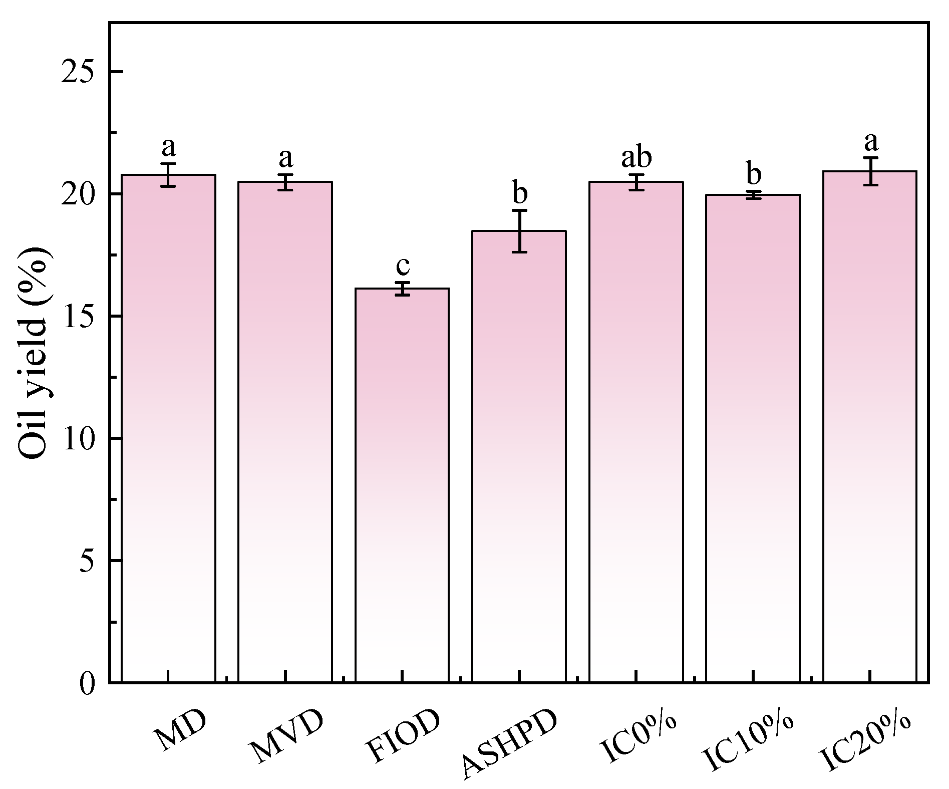 3.2.1. Effect of Different Drying Methods on the Quality of Idesia polycarpa Virgin Oil