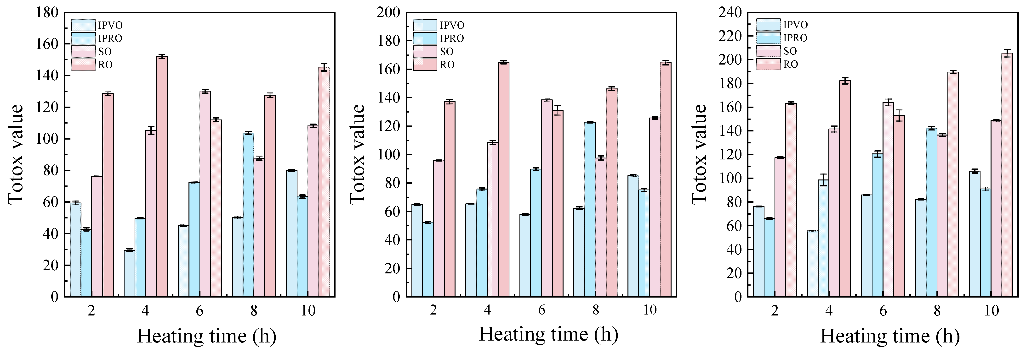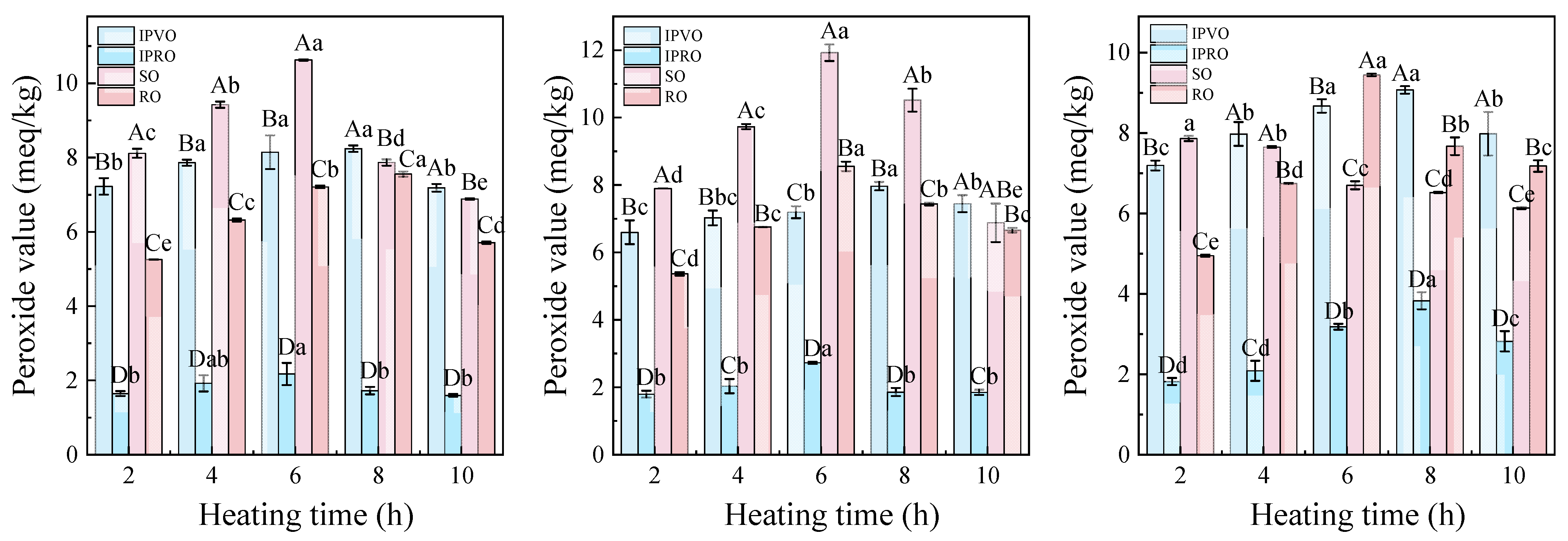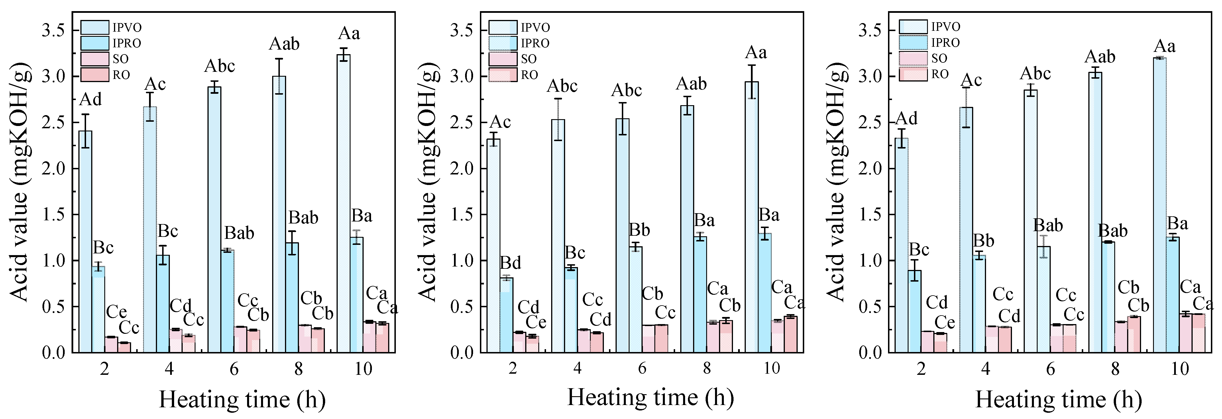 3.3. Changes in the Physicochemical Indices of IPVO, IPRO, SO and RO During the Heating Process