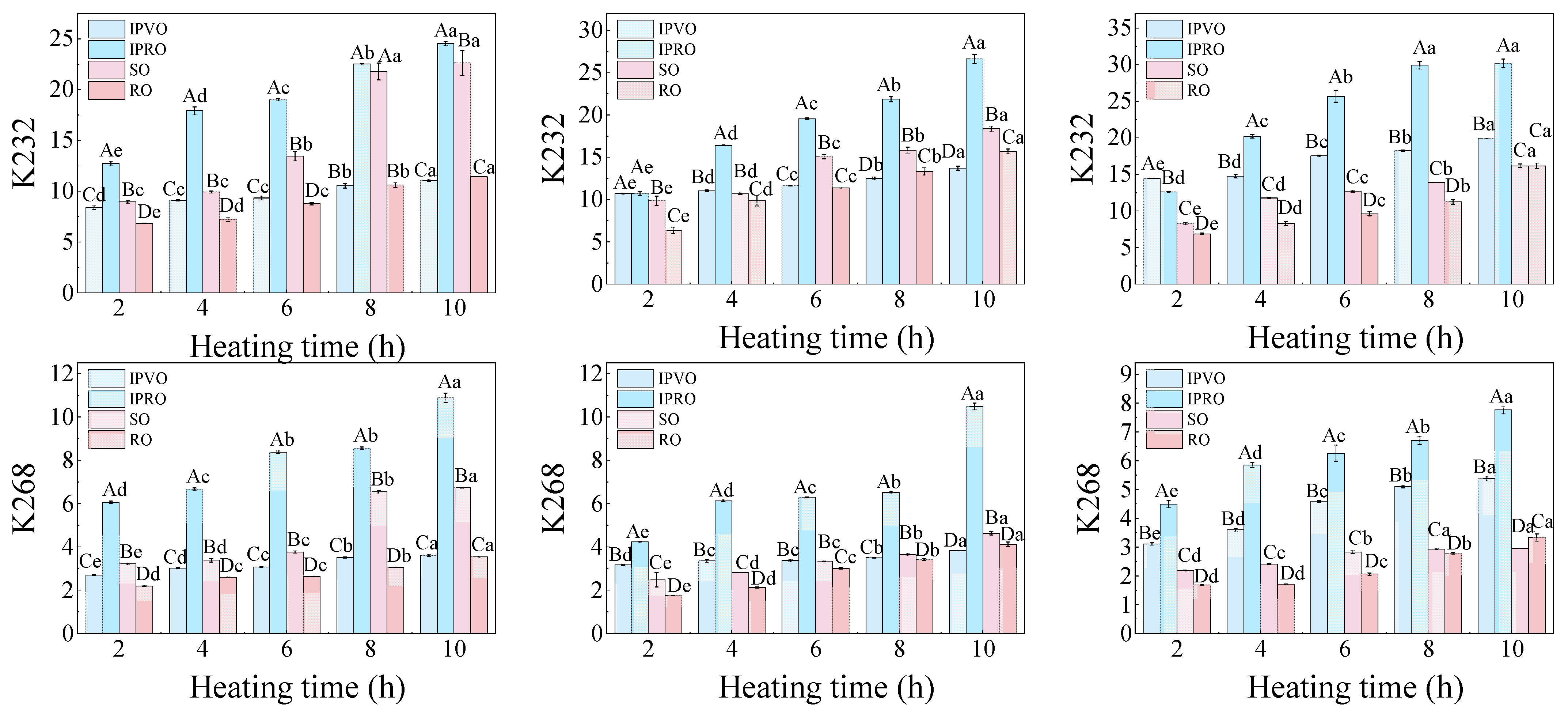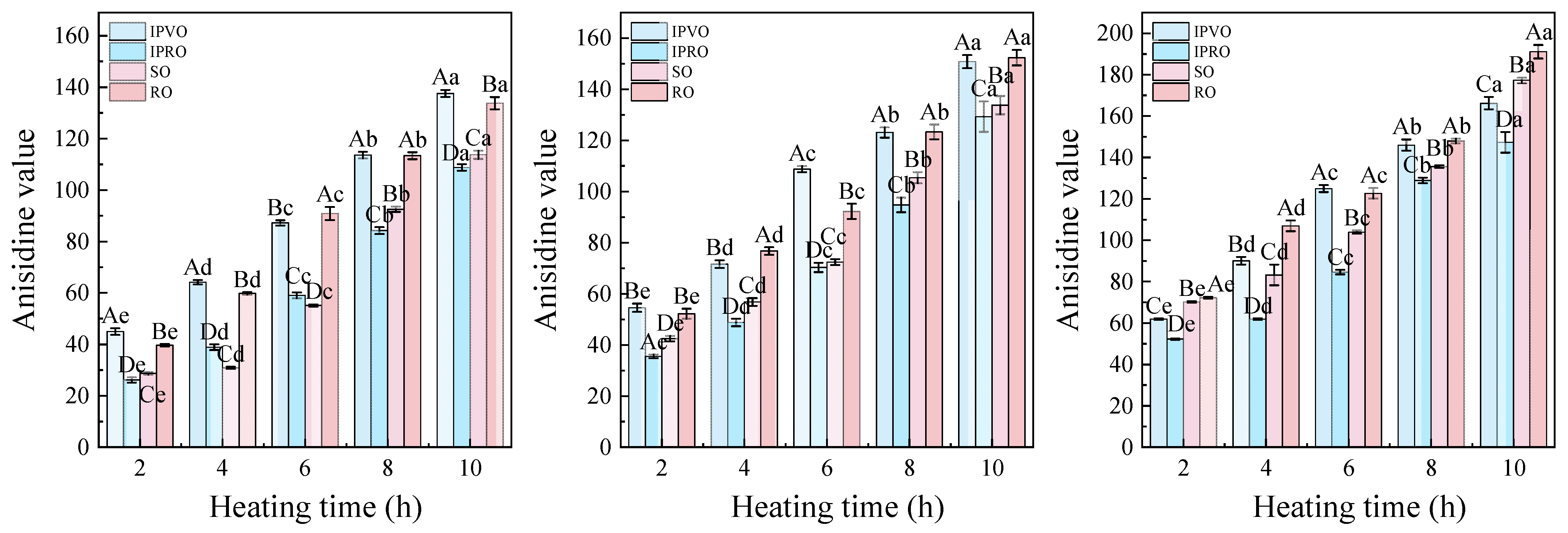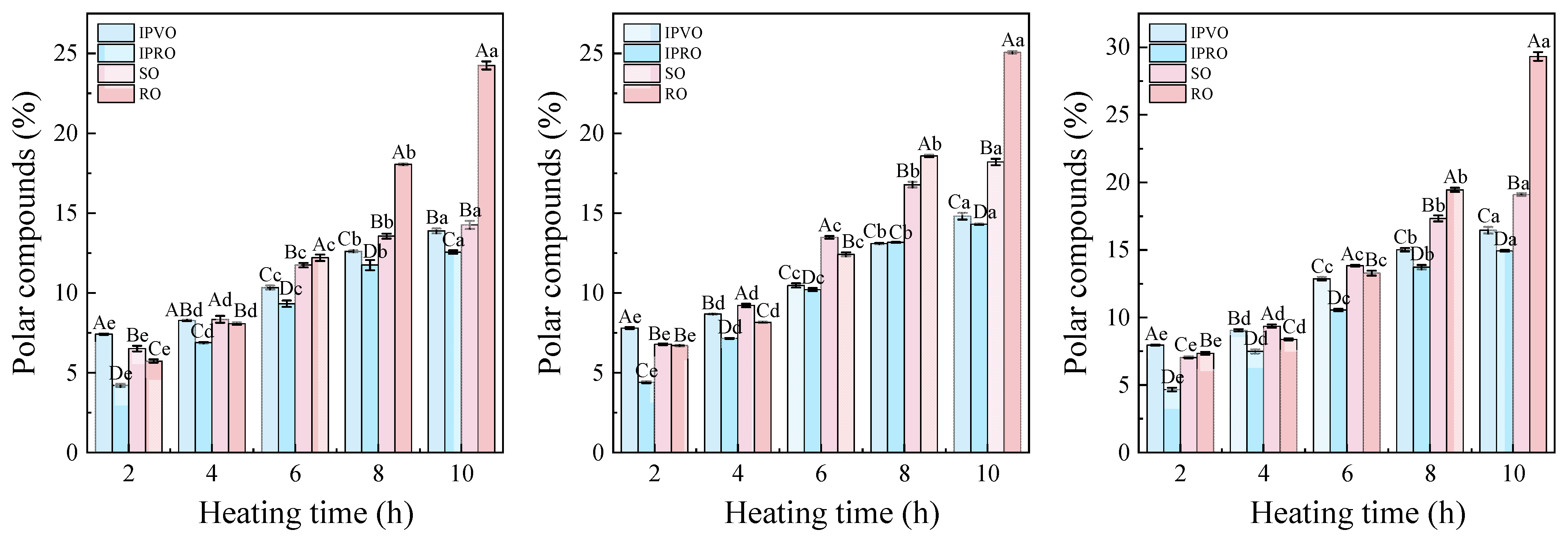 3.3. Changes in the Physicochemical Indices of IPVO, IPRO, SO and RO During the Heating Process