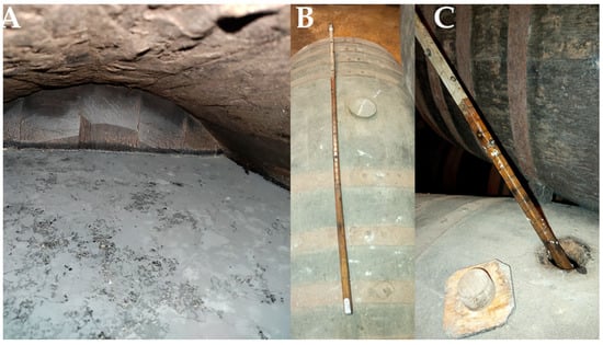 (A) Interior of a barrel with approximately 1/6 volume empty, to promote the development of the flor biofilm. (B) Aspilla (Dipstick). (C) Measuring the amount of wine contained in the barrel with a dipstick; traces of the flor can be seen on the dipstick. (Original photographs by authors).
