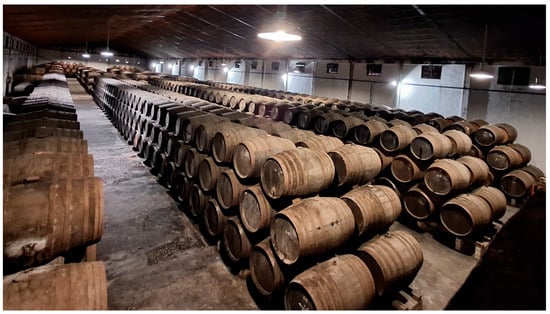 - Cañas, I.; Navia-Osorio, E.G.; Porras-Amores, C.; Mazarrón, F.R. Hygrothermal Conditions for the Biological Aging of Sherry Wine. Innov. Food Sci. Emerg. Technol. 2022, 82, 103164. [Google Scholar] [CrossRef]