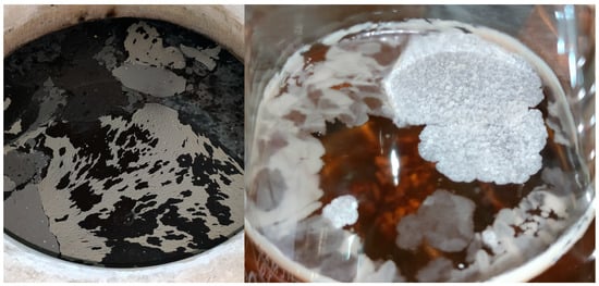 Flor veil (biofilm) on Fino wine surface. (A) Detail of the surface exposed to the air. (B) Detail of the surface exposed to the wine. (Original photographs by authors).