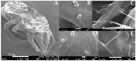 Scanning Electron Microscope (SEM) images. (A) Carpoglyphus lactis mite; (B–E) different microorganisms morphologies detected on mite exoskeletons. Source: original, mites samples were fixated, prepared and photographed with a JSM-7800 F Field Emission SEM (JEOL®) as indicated in [13].