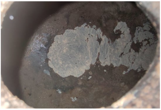 “Nata” (cream) formed around a “salidero” (wine seep or leakage spot). Mite aggregations could be observed in the biofilm together with Drosophila-like flies. (Original photograph by authors).