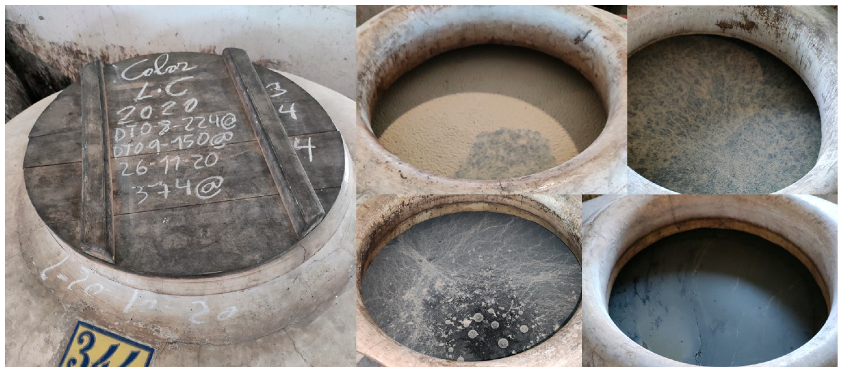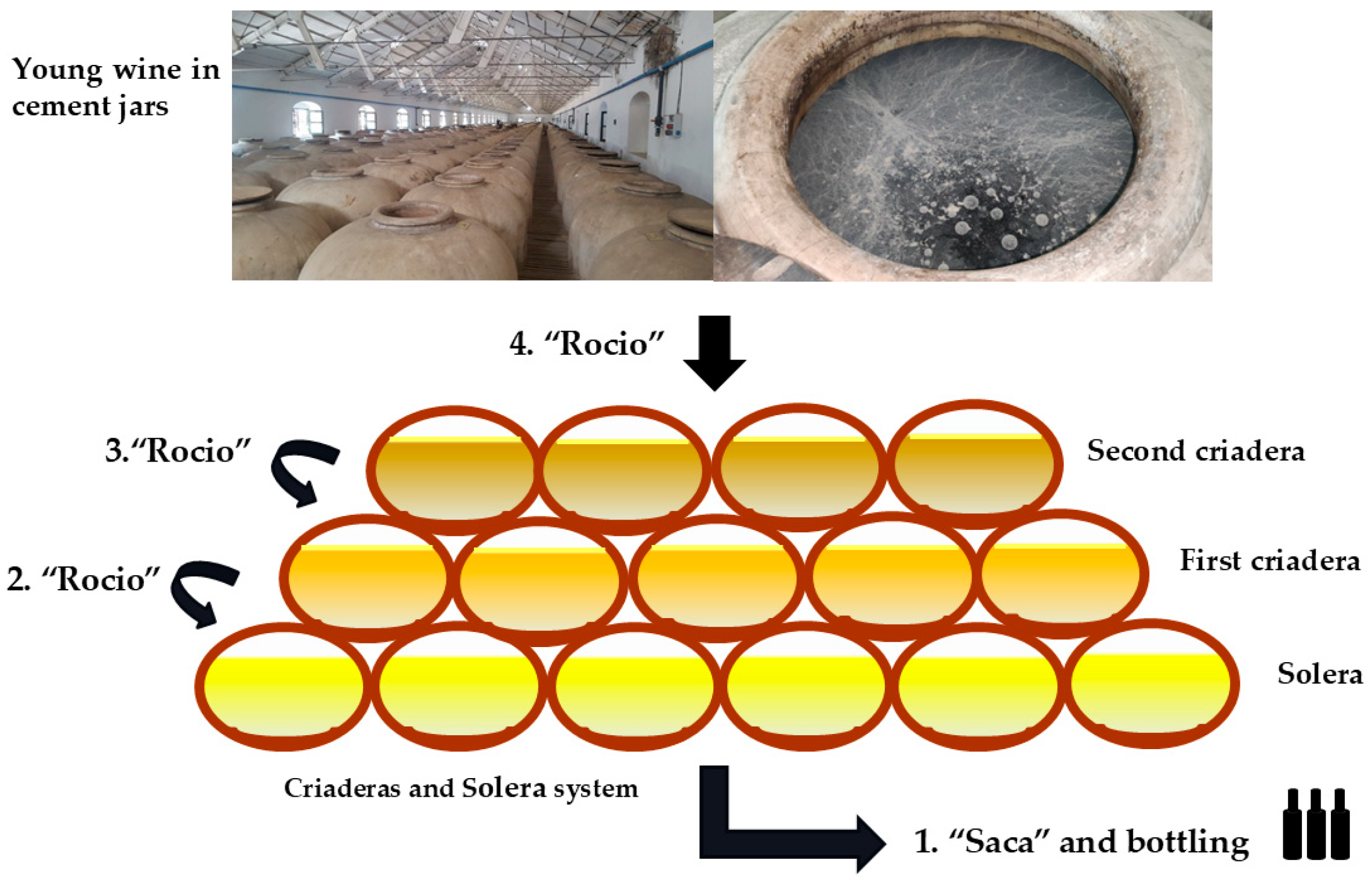 11]. However, in the Montilla-Moriles PDO: The freshly fermented, unfortified wine is stored in large-volume (2000 to 10,000 L) clay or cement jars, where it stabilizes before entering the Criaderas and Solera system [