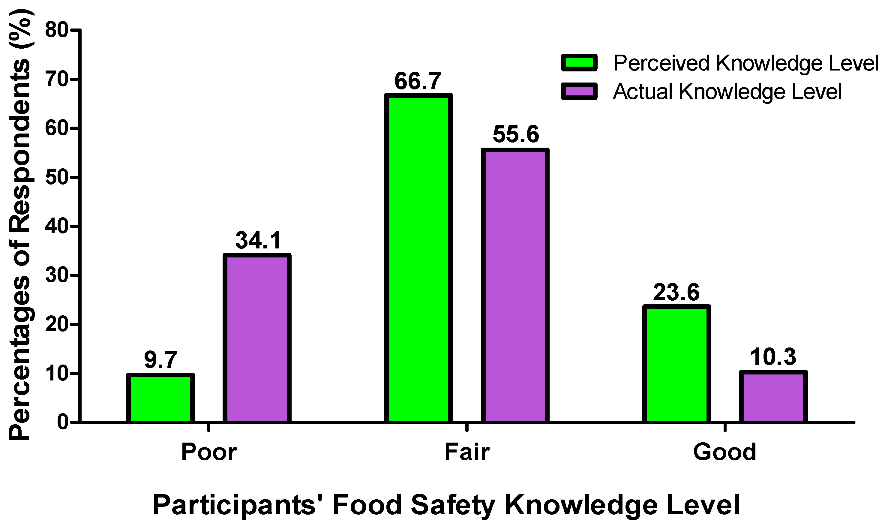 In order to evaluate the participants’ perceptions of their food safety knowledge for elderly care and their actual level of knowledge, their perceived and actual score of food safety knowledge were calculated and compared. The data showed that their actual knowledge of food safety was slightly different from the perceived knowledge of food safety reported by them. The number of participants achieving a “Good” food safety knowledge level, as determined in the Food Safety Knowledge Test (10.3%), was slightly lower than the food safety knowledge perceived by the caregivers themselves (23.6%). On the other hand, a larger number of participants obtained “Poor” food safety knowledge results (34.1%) than they perceived (9.7%). The majority of the respondents attained a “Fair” result in their actual (55.6%) and perceived (66.7%) food safety knowledge. Only the respondents who had poor food safety knowledge underestimated their knowledge.