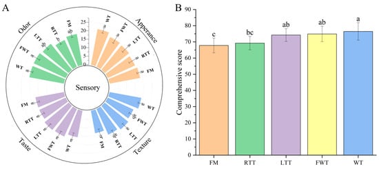 Sensory evaluation radar chart (A) and comprehensive score (B) of reduced-salt marinated large yellow croaker under different thawing treatments. Different lowercase letters above the bars in (B) indicate significant differences among groups (p < 0.05). FM: fresh marinated and immediately roasted, RTT: room-temperature thawing, LTT: low-temperature thawing, FWT: flowing-water thawing, WT: frozen direct roasted.