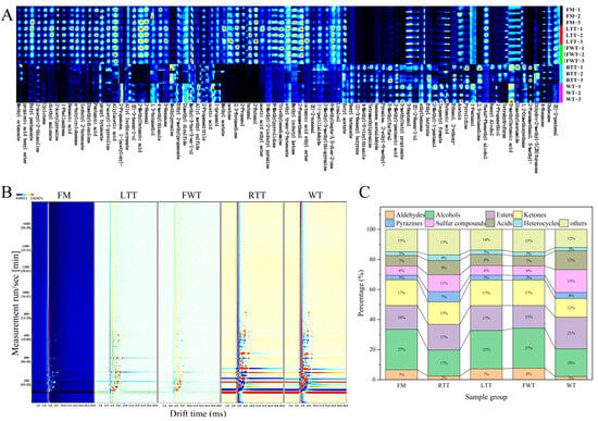 GC-IMS analysis revealed significant differences in VOC profiles between treatments (Figure 2A). The analysis identified 84 distinct VOCs, categorized into nine major chemical classes: 7 aldehydes, 15 alcohols, 18 esters, 12 ketones, 6 pyrazines, 6 sulfur-containing compounds, 8 acids, 3 heterocyclic compounds, and 9 miscellaneous compounds. The complete VOC profile, including compound identities and their relative abundances (%), is presented in Table S3. The gallery plot (Figure 2A) demonstrated three distinct clusters: (1) FM, LTT, and FWT that showed similar fingerprint patterns; (2) RTT and WT formed a separate cluster with partial overlap; and (3) a differential plot (Figure 2B) that clearly visualized these relationships, with LTT/FWT exhibiting higher overall VOC retention than FM (red signals), while RTT/WT showed selective compound depletion (blue signals). Composition analysis (Figure 2C) showed that alcohols, ketones, and esters collectively accounted for 58.71–59.88% of total VOCs in FM/LTT/FWT, whereas RTT showed reduced total volatiles (49.41%) and WT displayed a unique profile dominated by esters, alcohols, and sulfur compounds.