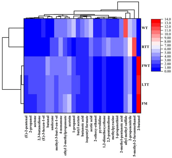 Heatmap analysis of key volatile organic compounds in reduced-salt marinated large yellow croaker across thawing treatments. FM: fresh marinated and immediately roasted, RTT: room-temperature thawing, LTT: low-temperature thawing, FWT: flowing-water thawing, WT: frozen direct roasted.