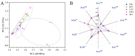 Multivariate analysis of volatile flavor profiles: (A) PCA score plot, (B) electronic nose sensor response patterns. Sensor designations and their main detection categories are as follows: W1C (aromatic substance), W5S (extremely sensitive to nitrogen oxides), W3C (ammonia, aromatic substance), W6S (hydrogen), W5C (alkanes, aromatic substances), W1S (methane), W1W (sulfur-containing compounds), W2S (alcohols, aldehydes), W2W (aromatic compounds, organic sulfides), and W3S (methane). FM: fresh marinated and immediately roasted, RTT: room-temperature thawing, LTT: low-temperature thawing, FWT: flowing-water thawing, WT: frozen direct roasted. The asterisk (*) represents significant difference (p < 0.05); ns denotes no significant difference.