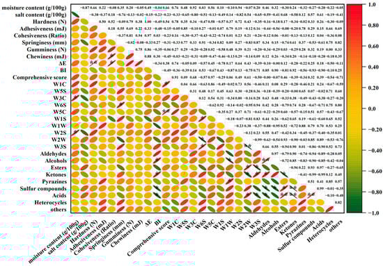 Pearson’s correlation analysis (|r| ≥ 0.8) revealed a complex interaction network among physicochemical, textural, and flavor characteristics (Figure 5). The color–texture axis demonstrated particularly strong associations, with hardness showing near-perfect positive correlation with ΔE (color difference, r ≈ 1.00). Hardness also showed a strong positive correlation with W1C (aromatic sensor, r = 0.78), and ΔE was positively related to W1C (r = 0.74). This triad of relationships establishes a “harder–greater color deviation (ΔE)” paradigm, indicating that textural changes are strongly associated with measured color parameters [56,57]. Simultaneously, moisture content appeared to be a key mediator, exhibiting dual pathways: positive correlations with fresh/roasty aromas (W2S/W3C, r = 0.92–0.94) through water retention mechanisms [58,59] and negative associations with salt content (r = −0.87) that indirectly modulated ester formation (r = 0.68) via salting-out effects [60].