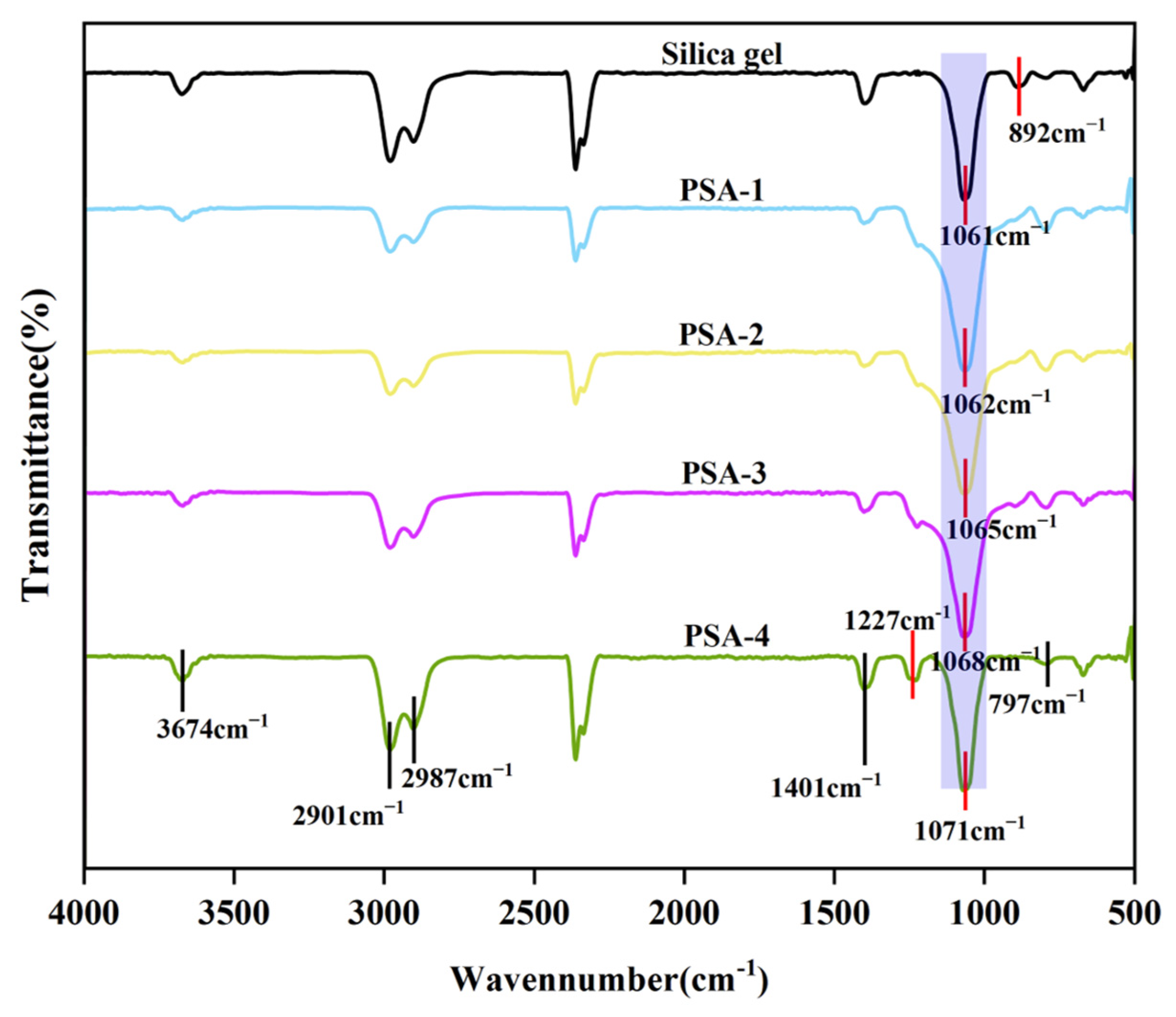 3.1. Structural Characterization of Silica Gel-Based Decolorizing Adsorbents