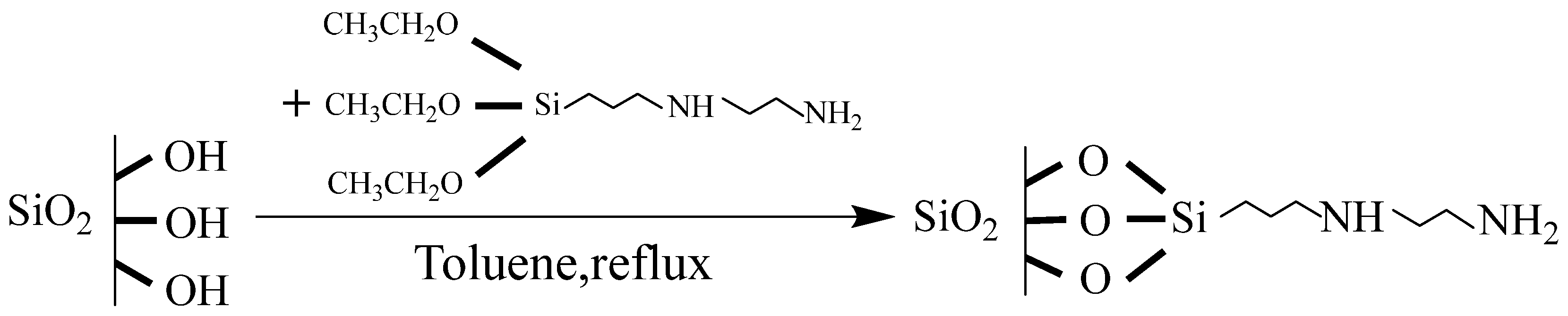 - Yin, Z.; Zhao, Q.; Xie, C.; He, G.; Xiao, Y. Fabrication of EDTA Modified Silica Gel toward Highly Efficient Adsorptive Removal of Copper Ions from Methanol. Sep. Purif. Technol. 2025, 370, 133225. [Google Scholar] [CrossRef]