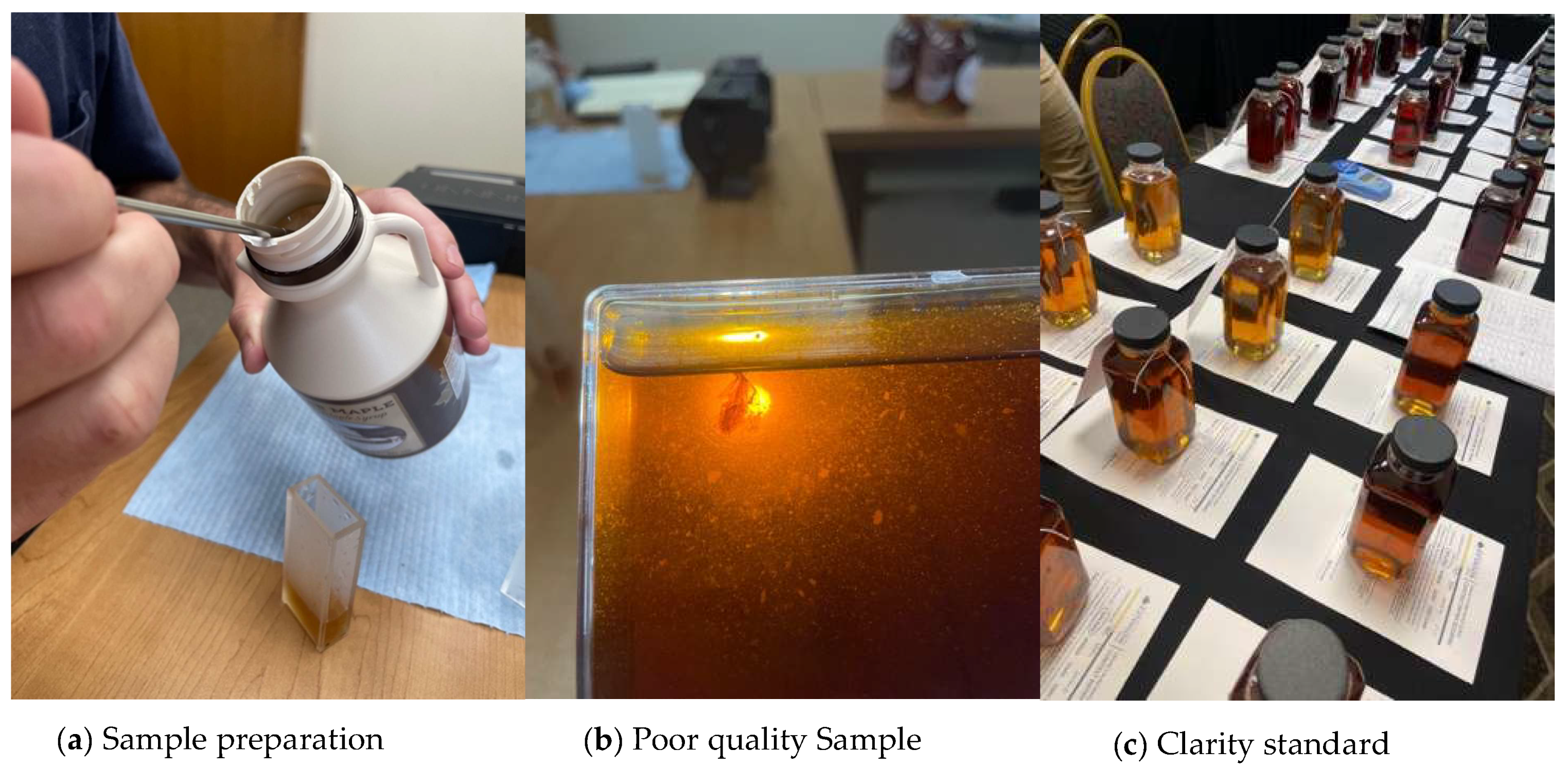 33], there remains a limited understanding of how retail maple syrup, especially products sold online, aligns with official grading standards. This study, therefore, assesses the compliance of consumer-purchased pure maple syrup with established quality standards, focusing on color, clarity, density, and flavor. The primary research questions are: