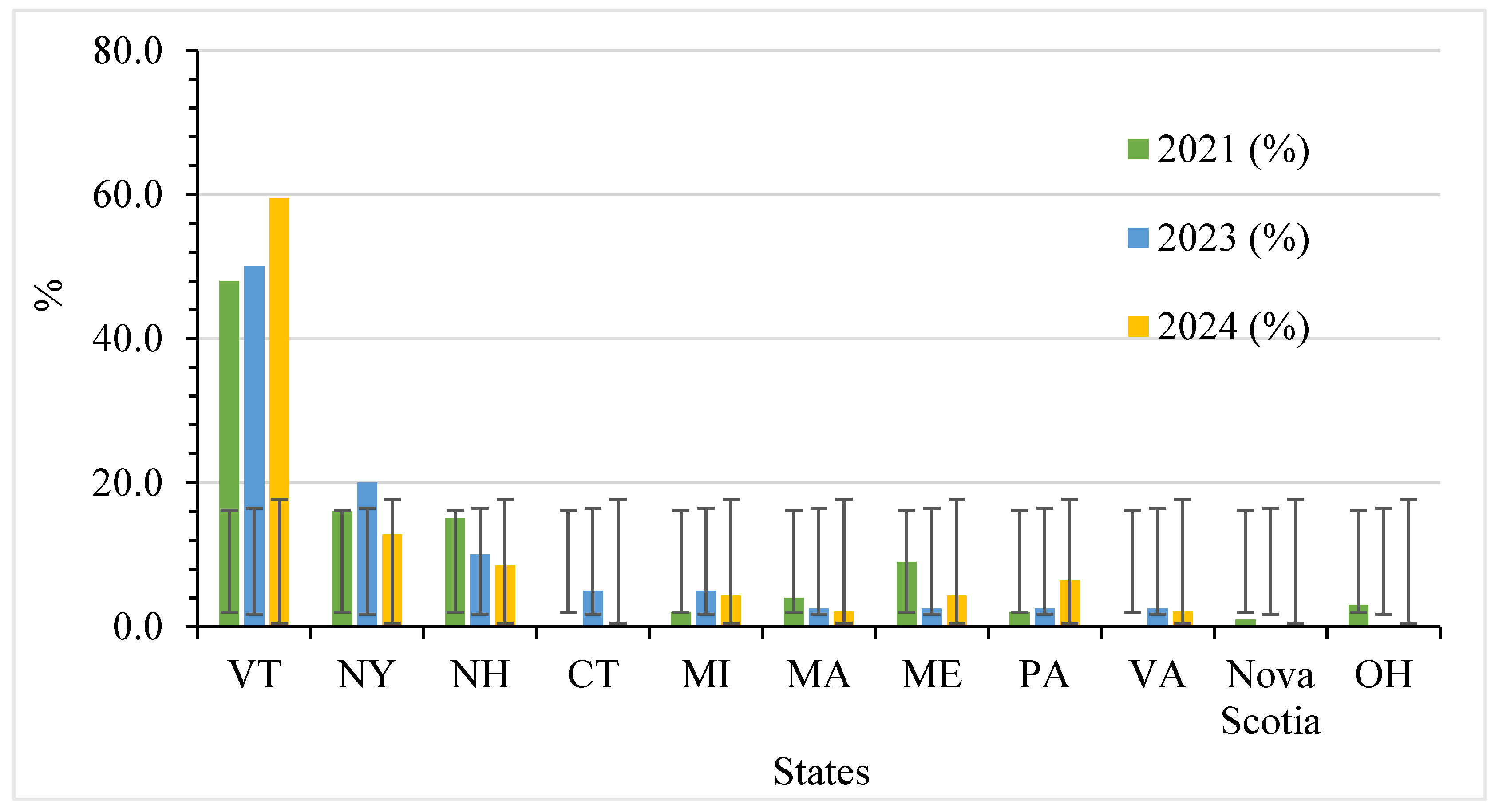 In 2023, Golden and Dark syrups showed a significant difference in color compliance (p = 4.19 × 10−7), reflecting considerable variation in producers’ ability to achieve the correct color grade across categories. Just like in 2021, Dark syrup had higher compliance than Golden syrup, indicating that Golden syrup was more prone to deviations in light-transmittance standards. This pattern persisted in 2024, with a continued significant difference in compliance between Golden and Dark syrups (p = 4.33 × 10−4). Although overall compliance improved from 2021, Golden syrup still lagged behind Dark syrup in meeting USDA color standards, confirming that Golden syrup remains the more challenging grade for producers to produce and market within the required specifications over the years. Therefore, due to these statistically significant differences in color compliance, consumers buying Golden syrup are much more likely to receive a product that does not meet the USDA color standard than those purchasing Dark syrup.