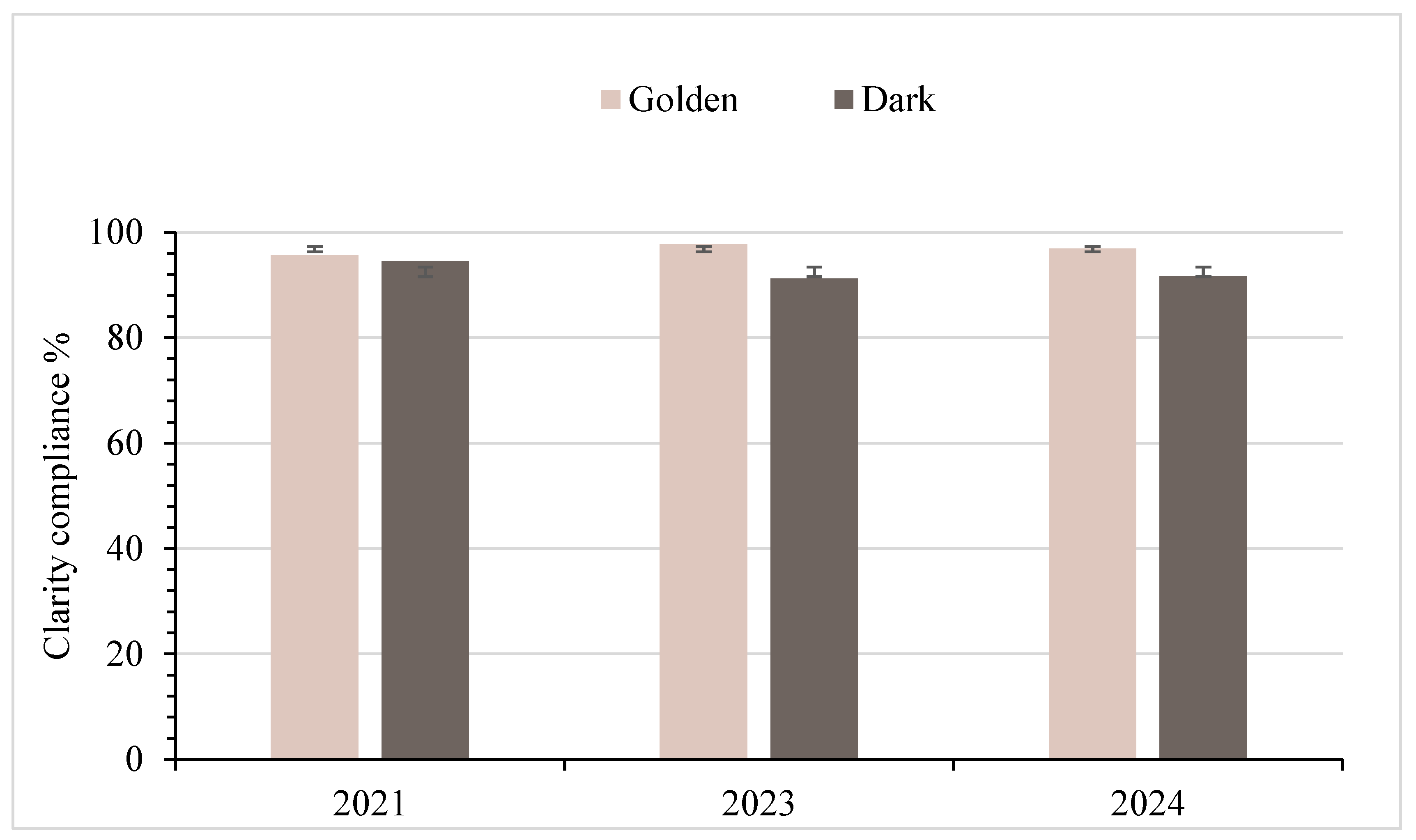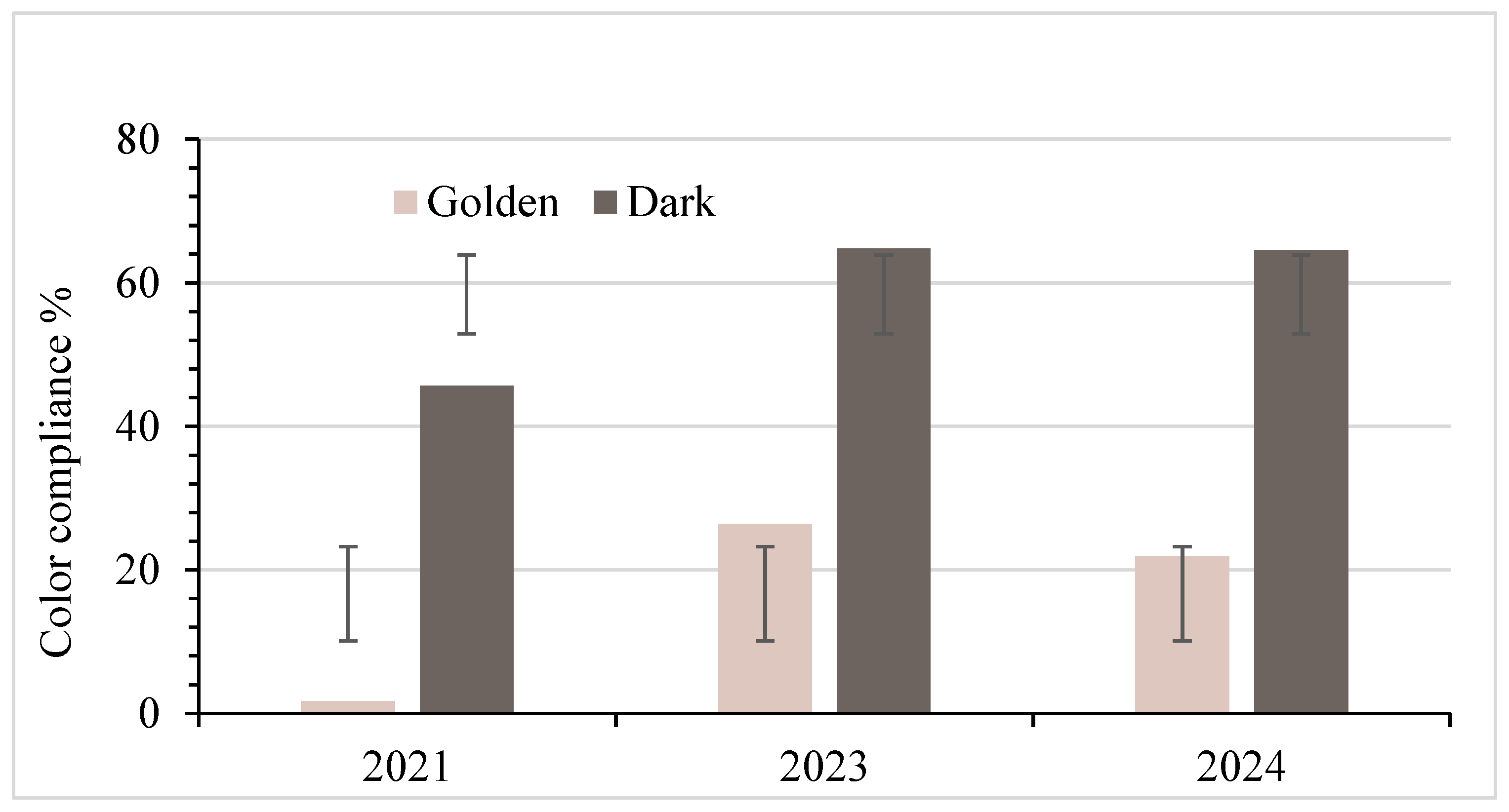 Statistical analysis revealed significant differences in color compliance between Golden and Dark maple syrup within each testing year. Golden syrup consistently showed the lowest compliance rates, with the most pronounced deviations occurring in 2021. These early results should be interpreted cautiously, as COVID-19-related laboratory access restrictions caused prolonged delays between sample acquisition and testing. During this period, samples were stored under mixed conditions, room temperature and refrigeration, which likely accelerated oxidative darkening, especially in HDPE plastic containers with higher oxygen permeability. This explains much of the reduced color-compliance rate observed in