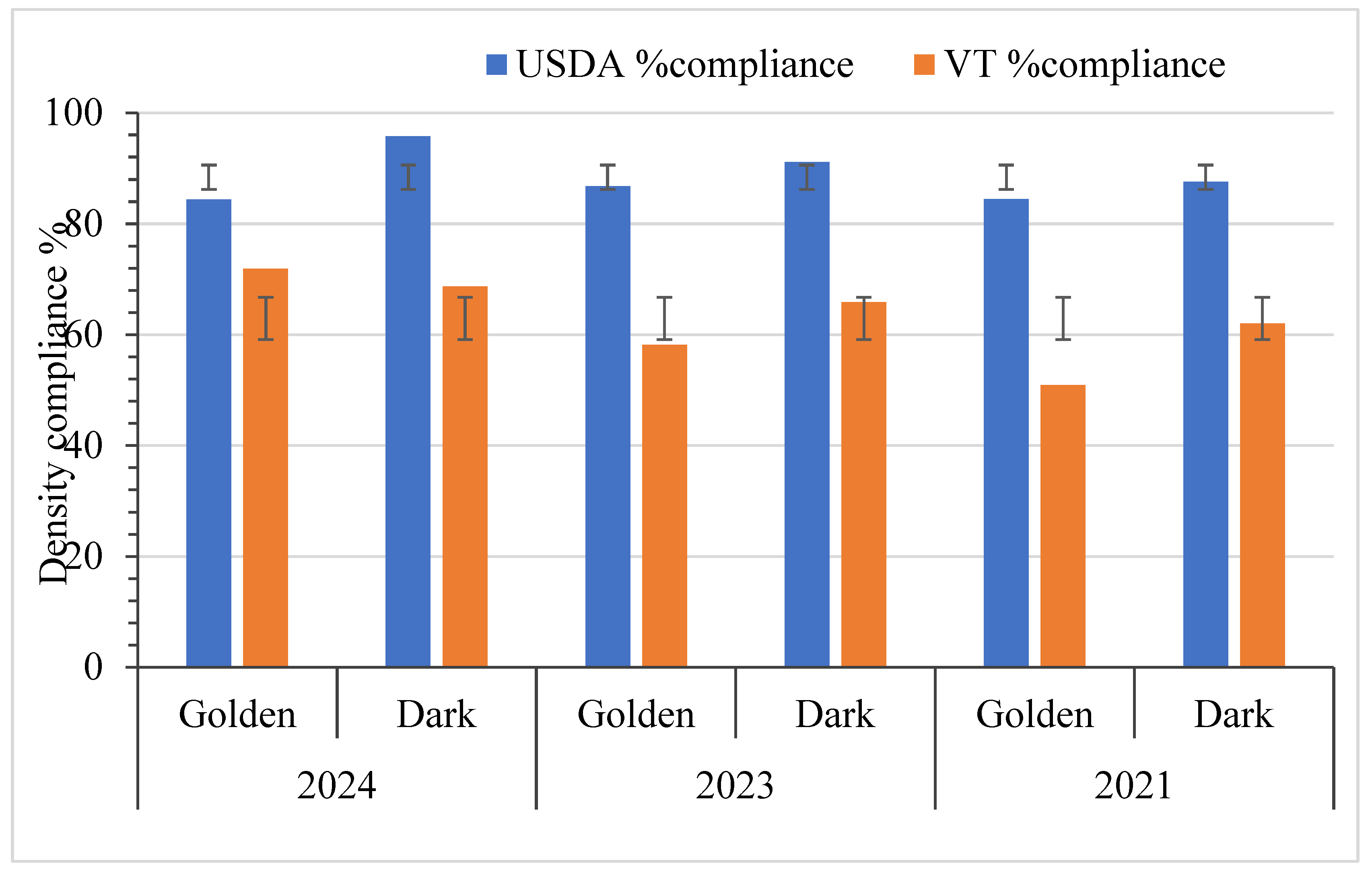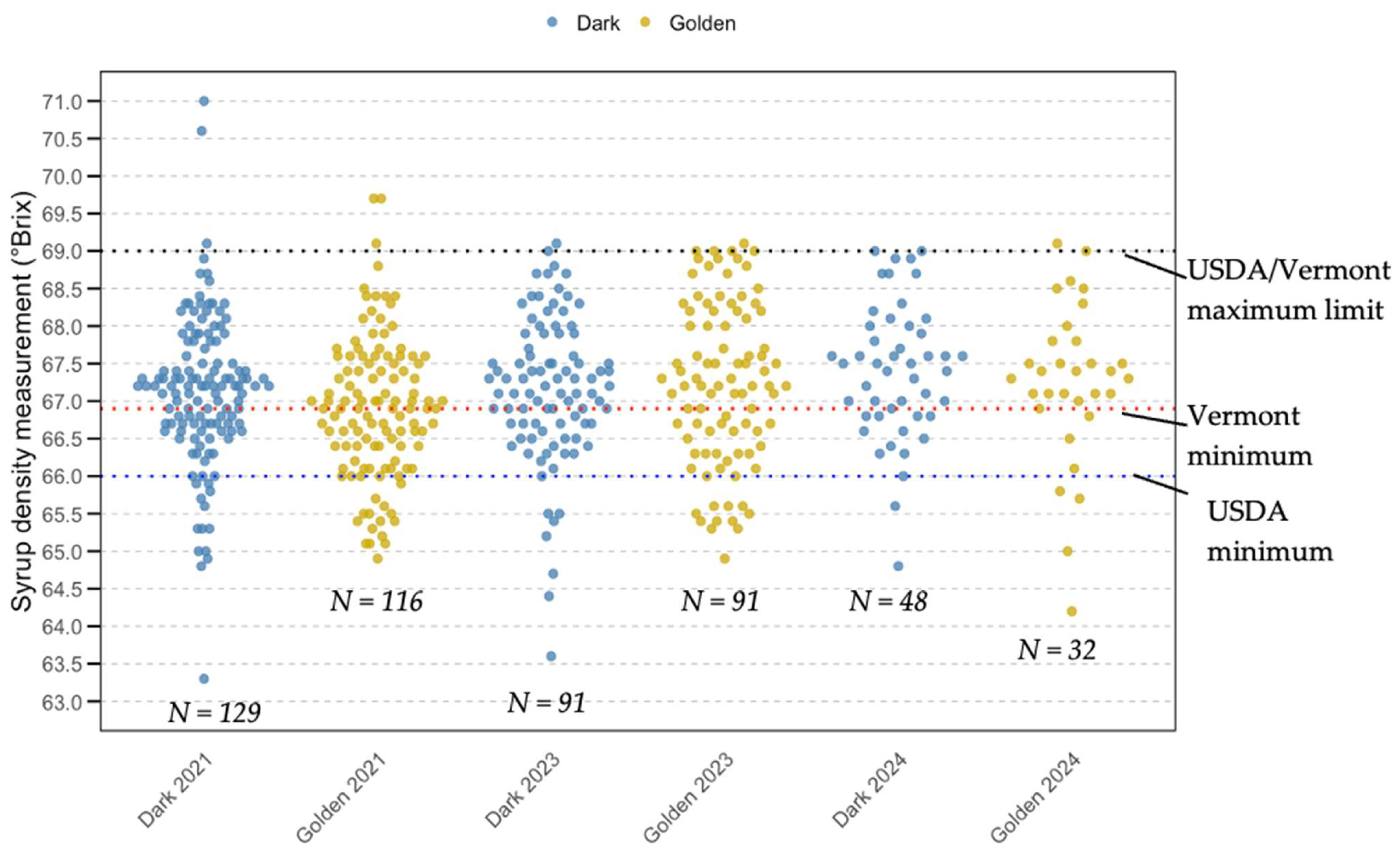 Statistical analysis showed no significant differences in density compliance between Golden and Dark syrup in 2021 or 2024. Within each grade, year-to-year variations were also not significant (Golden: p = 0.875; Dark: p = 0.271), suggesting stable density control practices across time and syrup types. This consistency reflects the practical application of standardized boiling and evaporation methods. These results also suggest that producers are not intentionally attempting to sell more syrup as Golden Delicate even if it does not meet the color grade. Bulk syrup buyers pay a higher price for Golden Delicate syrup compared to the darker grades, but such a price premium is not consistently observed for retail syrup sales. However, marginally lower compliance observed in specific Golden syrup batches, for example, 18 out of 116 in 2021, warrants ongoing monitoring due to the stricter consumer expectations and sensory sensitivity associated with this grade. In 2024, no statistically significant difference was found between Golden and Dark syrups in density compliance, indicating that syrup grade does not meaningfully affect the likelihood of consumers receiving an in- or out-of-compliance product. Of the samples determined to be out of grade for density, it was far more likely that they were below the standard than above it. This suggests an issue with producers accurately measuring syrup temperature, leading to syrup cooling enough to affect hydrometer readings.