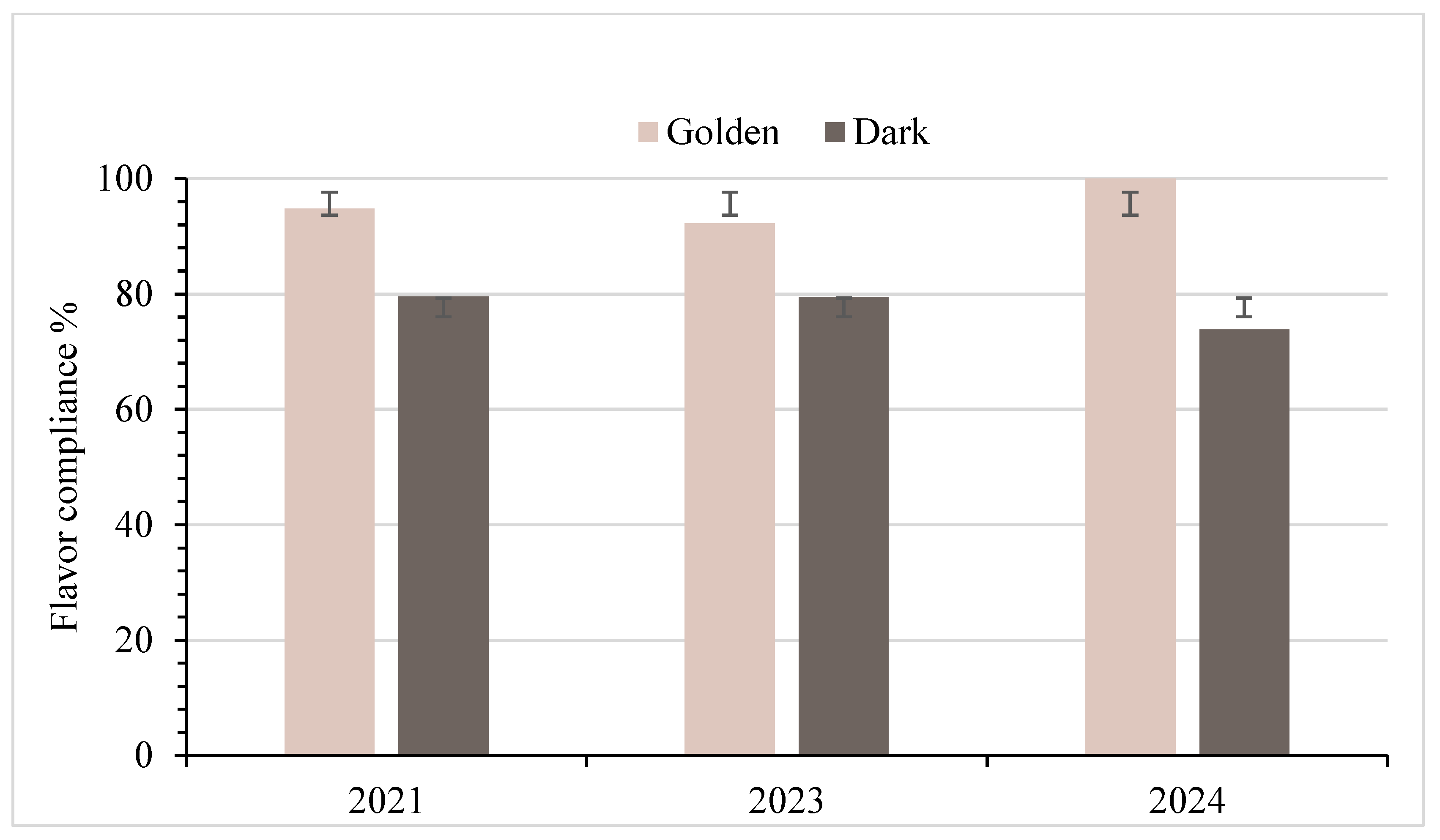 Fisher’s exact test was used to assess flavor compliance due to the small sample sizes in 2024. Statistically significant differences were observed between Golden and Dark syrups in each year (2021: p = 0.003; 2023: p = 0.015; 2024: p = 0.001), with Dark syrup showing consistently lower compliance rates. For example, in 2021, 21% of Dark samples had flavors that failed to meet the minimum Grade A flavor standards, compared to only 7% of Golden samples. These findings suggest a strong correlation between syrup grade and flavor quality. However, within-grade comparisons across years showed no significant difference (Golden: p = 0.246; Dark: p = 0.557), indicating stability in flavor compliance within each syrup type despite seasonal variability. This suggests that consumers are likely to consistently receive appropriate, compliant flavors when purchasing Golden syrup products, but may experience more off-flavors when purchasing Dark-Robust syrup. Nevertheless, the persistently lower performance of Dark syrup highlights opportunities for improvement, particularly in handling, boiling, and filtration practices during late-season production. The most frequent market infraction observed was low compliance with color standards, often due to darkening after packaging, but flavor remains a critical quality factor for consumer satisfaction. To improve overall syrup quality, producers would benefit from targeted education on grading standards, quality control tools, and best practices in filtration, evaporation, and storage. Intake inspection and consumer awareness can further reinforce adherence across the supply chain. The significant difference in 2024 flavor compliance between Golden and Dark syrup (p = 0.001) supports the hypothesis that syrup grade impacts a consumer’s likelihood of receiving a compliant product. The null hypothesis is therefore rejected. This result may also reflect the complexity of assessing Dark syrup, as certain flavor variations can be more challenging to distinguish from off-flavors. Providing additional training and resources could help producers develop greater consistency in evaluating what is and is not acceptable flavor within the Dark grade.