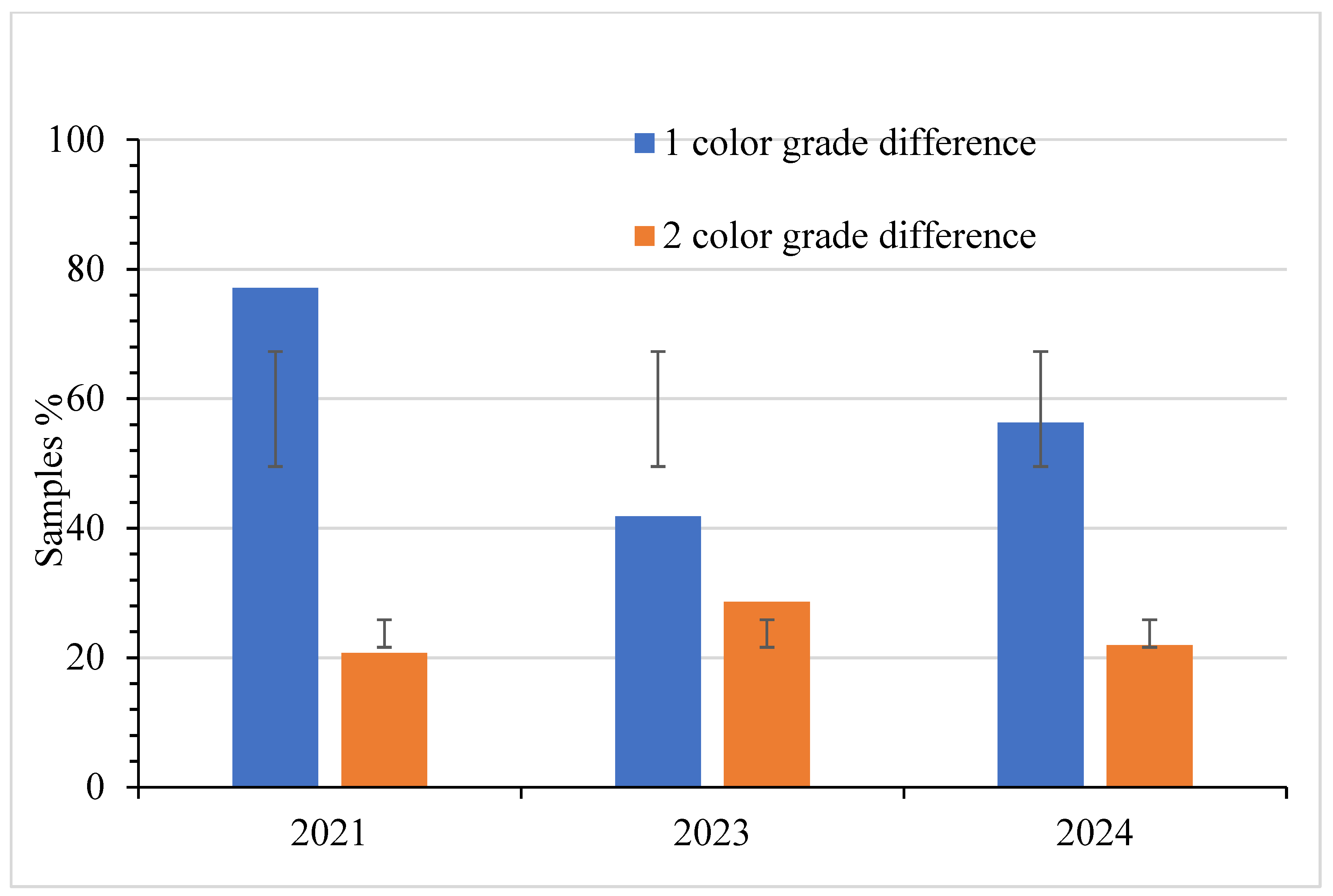 34]. These processes, combined with extended storage during the pandemic, likely contributed to the elevated darkening observed in 2021. The economic implications of storage-related darkening are substantial, as a shift in hue that no longer fits the assigned grade can diminish market value and consumer trust [