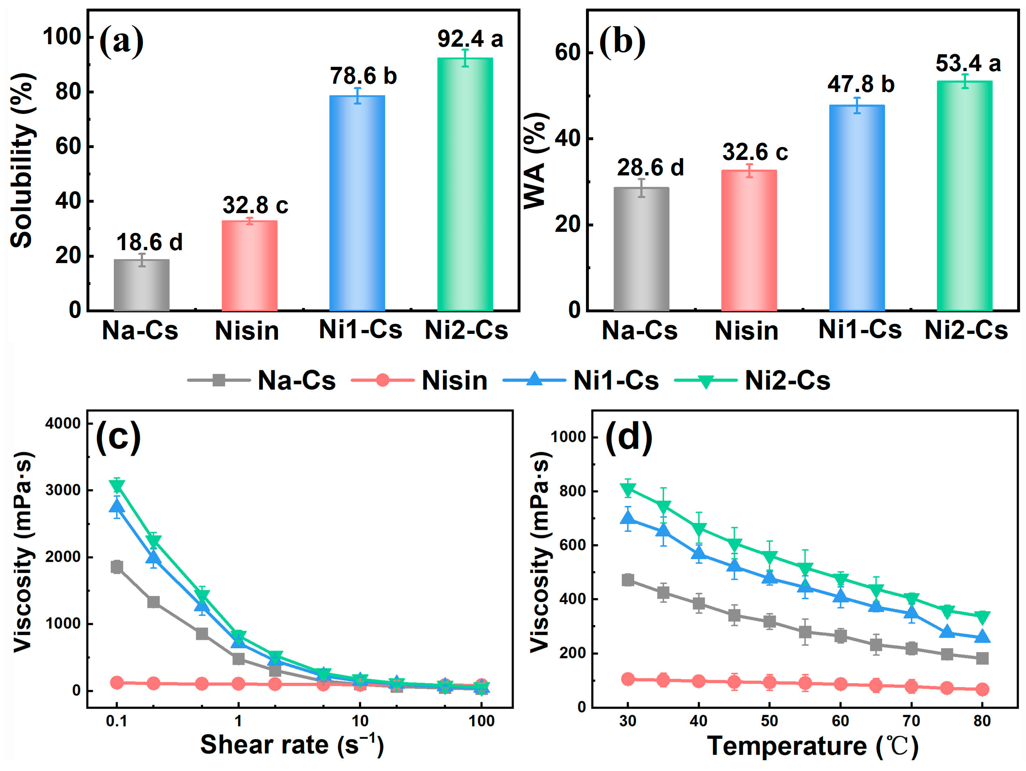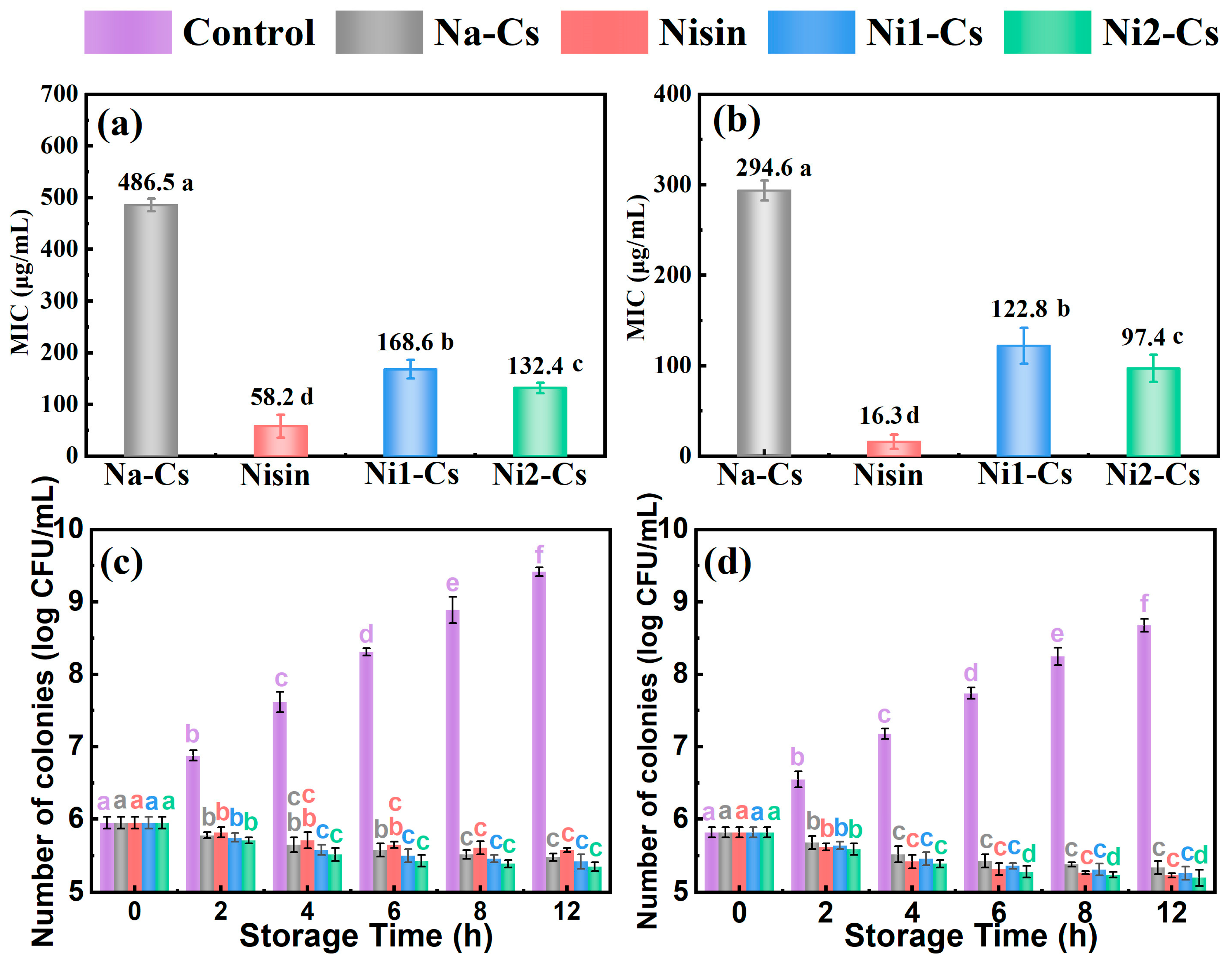 According to nisin amount, the grafted products were designated as Ni1-Cs (15 mmol nisin, grafting ratio 8.56%) and Ni2-Cs (30 mmol nisin, grafting ratio 14.35%). Native chitosan was designated as Na-Cs.