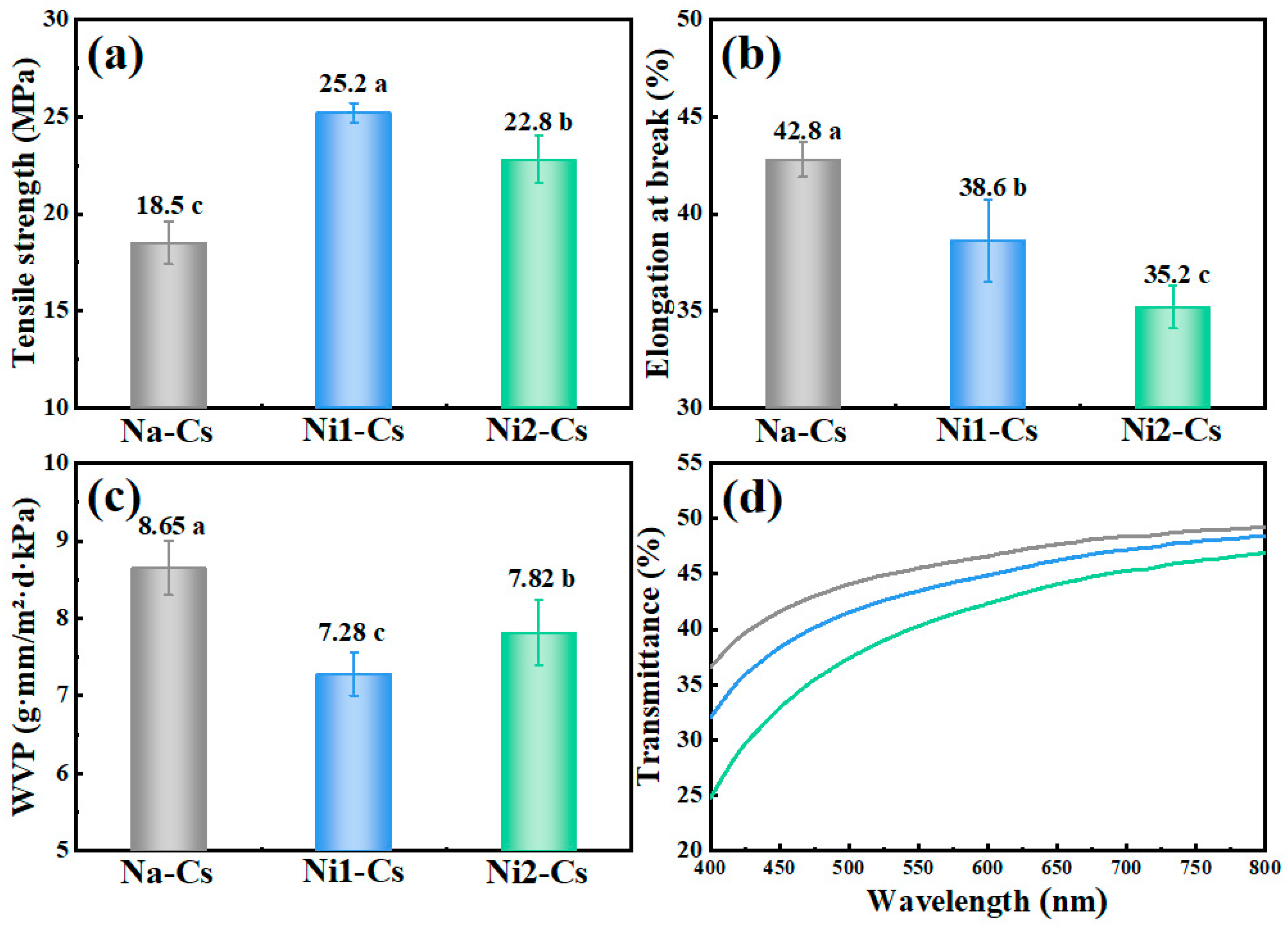 Notably, despite the reduction in molecular weight—typically associated with decreased mechanical strength—Ni1-Cs films achieved 36% higher tensile strength than Na-Cs (25.2 vs. 18.5 MPa). This paradoxical enhancement suggests that nisin grafting introduced new intermolecular interactions that created a more robust network structure. Nisin molecules contain multiple sites capable of forming hydrogen bonds (peptide backbones, hydroxyl groups) and hydrophobic interactions (Ile, Leu, Pro residues), which may establish physical crosslinks between chitosan chains during film formation. It is noteworthy that while moderate grafting (Ni1-Cs) enhanced the tensile strength compared to native chitosan, excessive grafting (Ni2-Cs) led to a slight reduction in mechanical performance and transparency, a phenomenon attributed to synergistic molecular mechanisms. Specifically, the preparation of Ni2-Cs resulted in a lower molecular weight (165.64 kDa) compared to Ni1-Cs, creating shorter polymer chains with fewer intermolecular entanglements that weaken the overall structural integrity of the film matrix. Simultaneously, the higher density of bulky nisin peptides in Ni2-Cs introduces significant steric hindrance that restricts the sliding and mobility of chitosan chains during stretching, directly accounting for the continuous decrease in elongation at break. Furthermore, the hydrophobic amino acid residues inherent in nisin likely induce micro-phase separation or aggregation within the hydrophilic chitosan matrix at high grafting ratios, creating micro-domains that act as light-scattering centers and thereby reducing the transparency of the Ni2-Cs films.