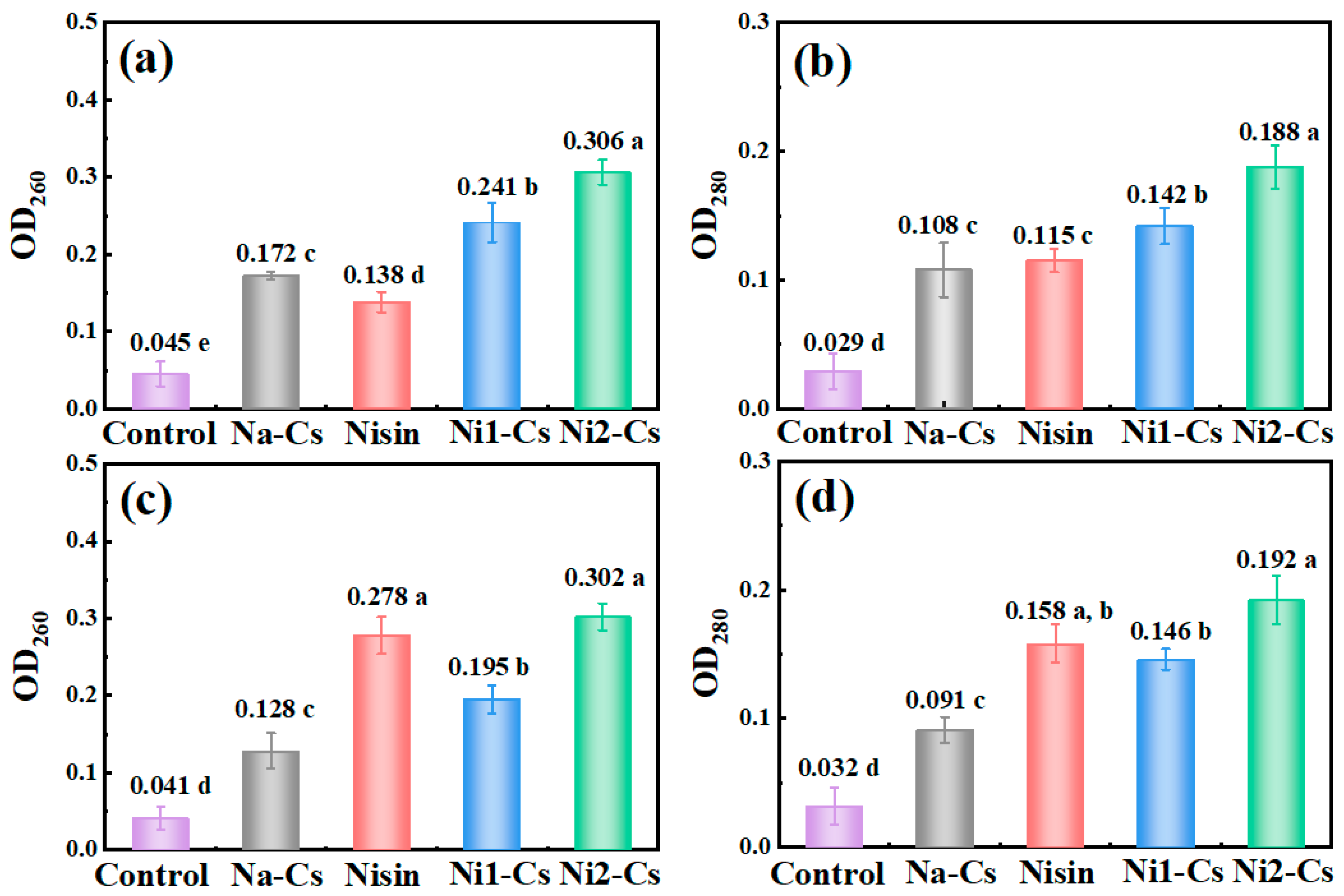 g, 10 min), and absorbance was measured at 260 and 280 nm wavelengths, representing the degree of nucleic acid and protein leakage, respectively [